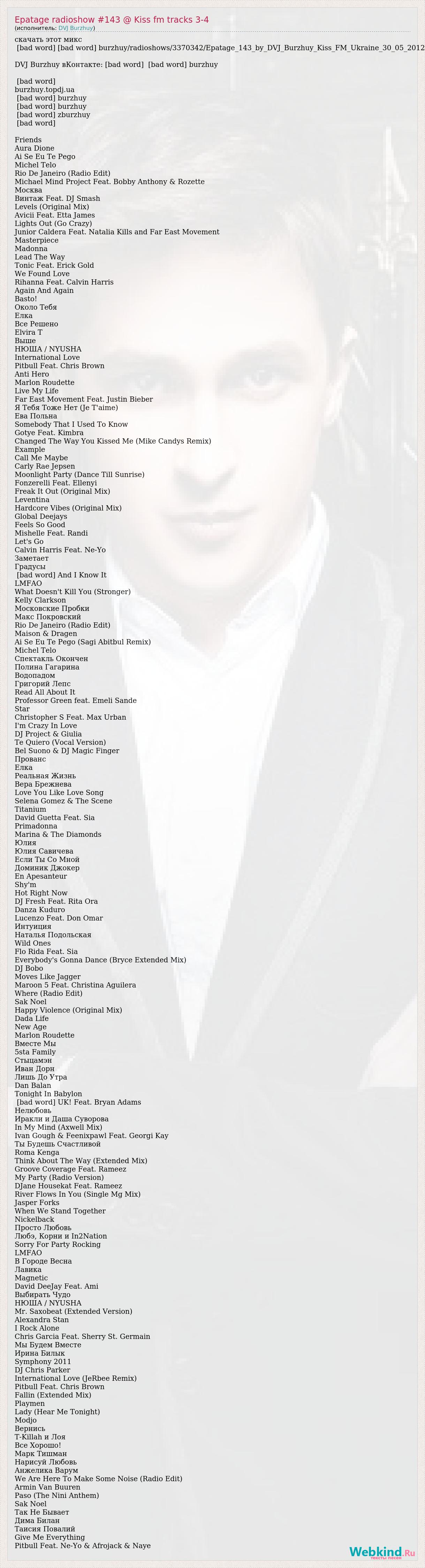 скачать этот микс [bad word] [bad word] burzhuy/radioshows/3370342/Epatage_143_by_DVJ_Burzhuy_Kiss_FM_Ukraine_30_05_2012 DVJ Burzhuy вКонтакте: [bad word] [bad word] burzhuy [bad word] burzhuy.topdj.ua [bad word] burzhuy [bad word] burzhuy [bad word] zburzhuy [bad word] Friends Aura Dione Ai Se Eu Te Pego Michel Telo Rio De Janeiro (Radio Edit) Michael Mind Project Feat. Bobby Anthony & Rozette Москва Винтаж Feat. DJ Smash Levels (Original Mix) Avicii Feat. Etta James Lights Out (Go Crazy) Junior Caldera Feat. Natalia Kills and Far East Movement Masterpiece Madonna Lead The Way Tonic Feat. Erick Gold We Found Love Rihanna Feat. Calvin Harris Again And Again Basto! Около Тебя Елка Все Решено Elvira Т Выше НЮША / NYUSHA International Love Pitbull Feat. Chris Brown Anti Hero Marlon Roudette Live My Life Far East Movement Feat. Justin Bieber Я Тебя Тоже Нет (Je T'aime) Ева Польна Somebody That I Used To Know Gotye Feat. Kimbra Changed The Way You Kissed Me (Mike Candys Remix) Example Call Me Maybe Carly Rae Jepsen Moonlight Party (Dance Till Sunrise) Fonzerelli Feat. Ellenyi Freak It Out (Original Mix) Leventina Hardcore Vibes (Original Mix) Global Deejays Feels So Good Mishelle Feat. Randi Let's Go Calvin Harris Feat. Ne-Yo Заметает Градусы [bad word] And I Know It LMFAO What Doesn't Kill You (Stronger) Kelly Clarkson Московские Пробки Макс Покровский Rio De Janeiro (Radio Edit) Maison & Dragen Ai Se Eu Te Pego (Sagi Abitbul Remix) Michel Telo Спектакль Окончен Полина Гагарина Водопадом Григорий Лепс Read All About It Professor Green feat. Emeli Sande Star Christopher S Feat. Max Urban I'm Crazy In Love DJ Project & Giulia Te Quiero (Vocal Version) Bel Suono & DJ Magic Finger Прованс Елка Реальная Жизнь Вера Брежнева Love You Like Love Song Selena Gomez & The Scene Titanium David Guetta Feat. Sia Primadonna Marina & The Diamonds Юлия Юлия Савичева Если Ты Со Мной Доминик Джокер En Apesanteur Shy'm Hot Right Now DJ Fresh Feat. Rita Ora Danza Kuduro Lucenzo Feat. Don Omar Интуиция Наталья Подольская Wild Ones Flo Rida Feat. Sia Everybody's Gonna Dance (Bryce Extended Mix) DJ Bobo Moves Like Jagger Maroon 5 Feat. Christina Aguilera Where (Radio Edit) Sak Noel Happy Violence (Original Mix) Dada Life New Age Marlon Roudette Вместе Мы 5sta Family Стыцамэн Иван Дорн Лишь До Утра Dan Balan Tonight In Babylon [bad word] UK! Feat. Bryan Adams Нелюбовь Иракли и Даша Суворова In My Mind (Axwell Mix) Ivan Gough & Feenixpawl Feat. Georgi Kay Ты Будешь Счастливой Roma Kenga Think About The Way (Extended Mix) Groove Coverage Feat. Rameez My Party (Radio Version) DJane Housekat Feat. Rameez River Flows In You (Single Mg Mix) Jasper Forks When We Stand Together Nickelback Просто Любовь Любэ, Корни и In2Natiоn Sorry For Party Rocking LMFAO В Городе Весна Лавика Magnetic David DeeJay Feat. Ami Выбирать Чудо НЮША / NYUSHA Mr. Saxobeat (Extended Version) Alexandra Stan I Rock Alone Chris Garcia Feat. Sherry St. Germain Мы Будем Вместе Ирина Билык Symphony 2011 DJ Chris Parker International Love (JeRbee Remix) Pitbull Feat. Chris Brown Fallin (Extended Mix) Playmen Lady (Hear Me Tonight) Modjo Вернись T-Killah и Лоя Все Хорошо! Марк Тишман Нарисуй Любовь Анжелика Варум We Are Here To Make Some Noise (Radio Edit) Armin Van Buuren Paso (The Nini Anthem) Sak Noel Так Не Бывает Дима Билан Таисия Повалий Give Me Everything Pitbull Feat. Ne-Yo & Afrojack & Naye