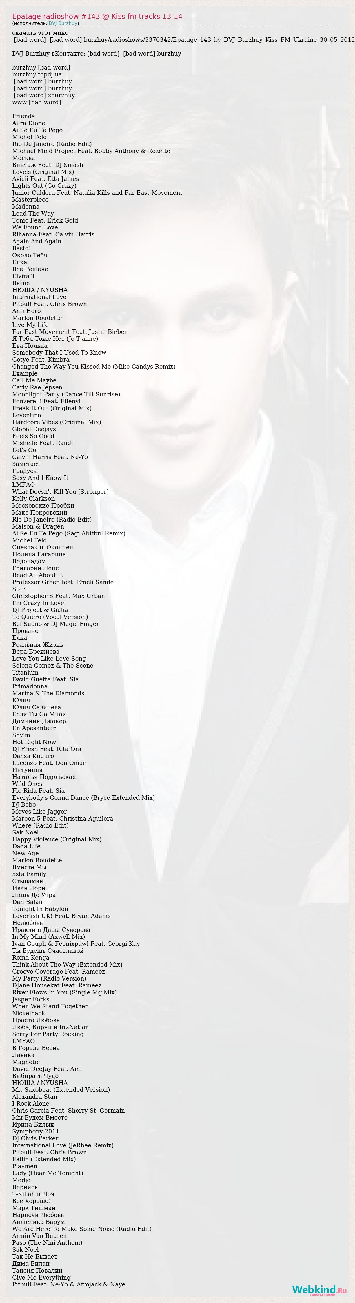 скачать этот микс [bad word] [bad word] burzhuy/radioshows/3370342/Epatage_143_by_DVJ_Burzhuy_Kiss_FM_Ukraine_30_05_2012 DVJ Burzhuy вКонтакте: [bad word] [bad word] burzhuy burzhuy [bad word] burzhuy.topdj.ua [bad word] burzhuy [bad word] burzhuy [bad word] zburzhuy www [bad word] Friends Aura Dione Ai Se Eu Te Pego Michel Telo Rio De Janeiro (Radio Edit) Michael Mind Project Feat. Bobby Anthony & Rozette Москва Винтаж Feat. DJ Smash Levels (Original Mix) Avicii Feat. Etta James Lights Out (Go Crazy) Junior Caldera Feat. Natalia Kills and Far East Movement Masterpiece Madonna Lead The Way Tonic Feat. Erick Gold We Found Love Rihanna Feat. Calvin Harris Again And Again Basto! Около Тебя Елка Все Решено Elvira Т Выше НЮША / NYUSHA International Love Pitbull Feat. Chris Brown Anti Hero Marlon Roudette Live My Life Far East Movement Feat. Justin Bieber Я Тебя Тоже Нет (Je T'aime) Ева Польна Somebody That I Used To Know Gotye Feat. Kimbra Changed The Way You Kissed Me (Mike Candys Remix) Example Call Me Maybe Carly Rae Jepsen Moonlight Party (Dance Till Sunrise) Fonzerelli Feat. Ellenyi Freak It Out (Original Mix) Leventina Hardcore Vibes (Original Mix) Global Deejays Feels So Good Mishelle Feat. Randi Let's Go Calvin Harris Feat. Ne-Yo Заметает Градусы Sexy And I Know It LMFAO What Doesn't Kill You (Stronger) Kelly Clarkson Московские Пробки Макс Покровский Rio De Janeiro (Radio Edit) Maison & Dragen Ai Se Eu Te Pego (Sagi Abitbul Remix) Michel Telo Спектакль Окончен Полина Гагарина Водопадом Григорий Лепс Read All About It Professor Green feat. Emeli Sande Star Christopher S Feat. Max Urban I'm Crazy In Love DJ Project & Giulia Te Quiero (Vocal Version) Bel Suono & DJ Magic Finger Прованс Елка Реальная Жизнь Вера Брежнева Love You Like Love Song Selena Gomez & The Scene Titanium David Guetta Feat. Sia Primadonna Marina & The Diamonds Юлия Юлия Савичева Если Ты Со Мной Доминик Джокер En Apesanteur Shy'm Hot Right Now DJ Fresh Feat. Rita Ora Danza Kuduro Lucenzo Feat. Don Omar Интуиция Наталья Подольская Wild Ones Flo Rida Feat. Sia Everybody's Gonna Dance (Bryce Extended Mix) DJ Bobo Moves Like Jagger Maroon 5 Feat. Christina Aguilera Where (Radio Edit) Sak Noel Happy Violence (Original Mix) Dada Life New Age Marlon Roudette Вместе Мы 5sta Family Стыцамэн Иван Дорн Лишь До Утра Dan Balan Tonight In Babylon Loverush UK! Feat. Bryan Adams Нелюбовь Иракли и Даша Суворова In My Mind (Axwell Mix) Ivan Gough & Feenixpawl Feat. Georgi Kay Ты Будешь Счастливой Roma Kenga Think About The Way (Extended Mix) Groove Coverage Feat. Rameez My Party (Radio Version) DJane Housekat Feat. Rameez River Flows In You (Single Mg Mix) Jasper Forks When We Stand Together Nickelback Просто Любовь Любэ, Корни и In2Natiоn Sorry For Party Rocking LMFAO В Городе Весна Лавика Magnetic David DeeJay Feat. Ami Выбирать Чудо НЮША / NYUSHA Mr. Saxobeat (Extended Version) Alexandra Stan I Rock Alone Chris Garcia Feat. Sherry St. Germain Мы Будем Вместе Ирина Билык Symphony 2011 DJ Chris Parker International Love (JeRbee Remix) Pitbull Feat. Chris Brown Fallin (Extended Mix) Playmen Lady (Hear Me Tonight) Modjo Вернись T-Killah и Лоя Все Хорошо! Марк Тишман Нарисуй Любовь Анжелика Варум We Are Here To Make Some Noise (Radio Edit) Armin Van Buuren Paso (The Nini Anthem) Sak Noel Так Не Бывает Дима Билан Таисия Повалий Give Me Everything Pitbull Feat. Ne-Yo & Afrojack & Naye