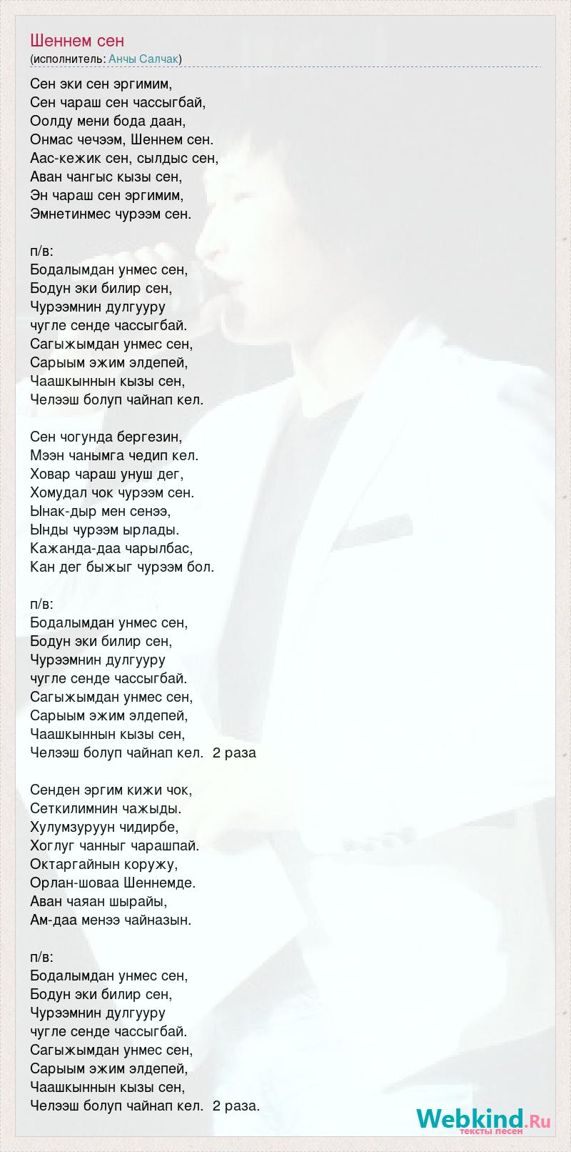 Сен эки сен эргимим, Сен чараш сен чассыгбай, Оолду мени бода даан, Онмас чечээм, Шеннем сен. Аас-кежик сен, сылдыс сен, Аван чангыс кызы сен, Эн чараш сен эргимим, Эмнетинмес чурээм сен. п/в: Бодалымдан унмес сен, Бодун эки билир сен, Чурээмнин дулгууру чугле сенде чассыгбай. Сагыжымдан унмес сен, Сарыым эжим элдепей, Чаашкыннын кызы сен, Челээш болуп чайнап кел. Сен чогунда бергезин, Мээн чанымга чедип кел. Ховар чараш унуш дег, Хомудал чок чурээм сен. Ынак-дыр мен сенээ, Ынды чурээм ырлады. Кажанда-даа чарылбас, Кан дег быжыг чурээм бол. п/в: Бодалымдан унмес сен, Бодун эки билир сен, Чурээмнин дулгууру чугле сенде чассыгбай. Сагыжымдан унмес сен, Сарыым эжим элдепей, Чаашкыннын кызы сен, Челээш болуп чайнап кел. 2 раза Сенден эргим кижи чок, Сеткилимнин чажыды. Хулумзуруун чидирбе, Хоглуг чанныг чарашпай. Октаргайнын коружу, Орлан-шоваа Шеннемде. Аван чаяан шырайы, Ам-даа менээ чайназын. п/в: Бодалымдан унмес сен, Бодун эки билир сен, Чурээмнин дулгууру чугле сенде чассыгбай. Сагыжымдан унмес сен, Сарыым эжим элдепей, Чаашкыннын кызы сен, Челээш болуп чайнап кел. 2 раза.