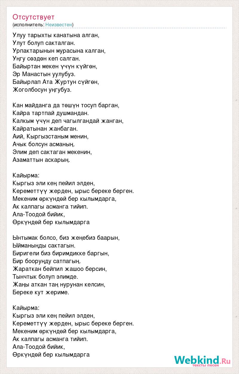 Улуу тарыхты канатына алган, Улут болуп сакталган. Урпактарынын мурасына калган, Уңгу сөздөн кеп салган. Байыртан мекен үчүн күйгөн, Эр Манастын уулубуз. Байырлап Ата Журтун сүйгөн, Жоголбосун уңгубуз. Кан майданга да төшүн тосуп барган, Кайра тартпай душмандан. Калкым үчүн деп чагылгандай жанган, Кайратынан жанбаган. Аий, Кыргызстаным менин, Ачык болсун асманың. Элим деп сактаган мекенин, Азаматтын аскарың. Кайырма: Кыргыз эли кең пейил элден, Кереметтүү жерден, ырыс береке берген. Мекеним өркүндөй бер кылымдарга, Ак калпагы асманга тийип. Ала-Тоодой бийик, Өркүндөй бер кылымдарга Ынтымак болсо, биз жеңебиз баарын, Ыйманыңды сактагын. Биригели биз биримдикке баргын, Бир бооруңду сатпагың. Жараткан бейпил жашоо берсин, Тынчтык болуп элимде. Жаңы аткан таң нурунан келсин, Береке кут жериме. Кайырма: Кыргыз эли кең пейил элден, Кереметтүү жерден, ырыс береке берген. Мекеним өркүндөй бер кылымдарга, Ак калпагы асманга тийип. Ала-Тоодой бийик, Өркүндөй бер кылымдарга