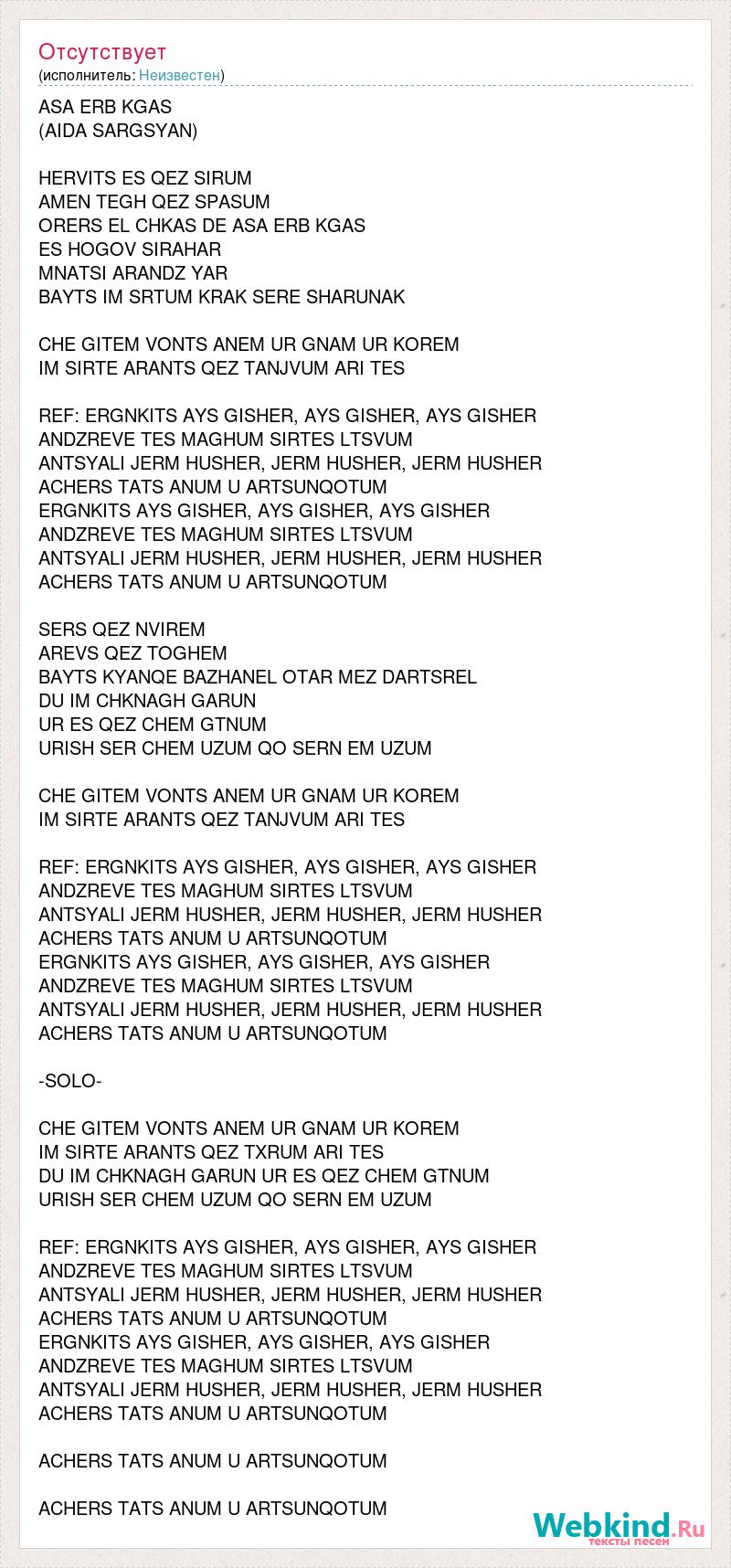 ASA ERB KGAS (AIDA SARGSYAN) HERVITS ES QEZ SIRUM AMEN TEGH QEZ SPASUM ORERS EL CHKAS DE ASA ERB KGAS ES HOGOV SIRAHAR MNATSI ARANDZ YAR BAYTS IM SRTUM KRAK SERE SHARUNAK CHE GITEM VONTS ANEM UR GNAM UR KOREM IM SIRTE ARANTS QEZ TANJVUM ARI TES REF: ERGNKITS AYS GISHER, AYS GISHER, AYS GISHER ANDZREVE TES MAGHUM SIRTES LTSVUM ANTSYALI JERM HUSHER, JERM HUSHER, JERM HUSHER ACHERS TATS ANUM U ARTSUNQOTUM ERGNKITS AYS GISHER, AYS GISHER, AYS GISHER ANDZREVE TES MAGHUM SIRTES LTSVUM ANTSYALI JERM HUSHER, JERM HUSHER, JERM HUSHER ACHERS TATS ANUM U ARTSUNQOTUM SERS QEZ NVIREM AREVS QEZ TOGHEM BAYTS KYANQE BAZHANEL OTAR MEZ DARTSREL DU IM CHKNAGH GARUN UR ES QEZ CHEM GTNUM URISH SER CHEM UZUM QO SERN EM UZUM CHE GITEM VONTS ANEM UR GNAM UR KOREM IM SIRTE ARANTS QEZ TANJVUM ARI TES REF: ERGNKITS AYS GISHER, AYS GISHER, AYS GISHER ANDZREVE TES MAGHUM SIRTES LTSVUM ANTSYALI JERM HUSHER, JERM HUSHER, JERM HUSHER ACHERS TATS ANUM U ARTSUNQOTUM ERGNKITS AYS GISHER, AYS GISHER, AYS GISHER ANDZREVE TES MAGHUM SIRTES LTSVUM ANTSYALI JERM HUSHER, JERM HUSHER, JERM HUSHER ACHERS TATS ANUM U ARTSUNQOTUM -SOLO- CHE GITEM VONTS ANEM UR GNAM UR KOREM IM SIRTE ARANTS QEZ TXRUM ARI TES DU IM CHKNAGH GARUN UR ES QEZ CHEM GTNUM URISH SER CHEM UZUM QO SERN EM UZUM REF: ERGNKITS AYS GISHER, AYS GISHER, AYS GISHER ANDZREVE TES MAGHUM SIRTES LTSVUM ANTSYALI JERM HUSHER, JERM HUSHER, JERM HUSHER ACHERS TATS ANUM U ARTSUNQOTUM ERGNKITS AYS GISHER, AYS GISHER, AYS GISHER ANDZREVE TES MAGHUM SIRTES LTSVUM ANTSYALI JERM HUSHER, JERM HUSHER, JERM HUSHER ACHERS TATS ANUM U ARTSUNQOTUM ACHERS TATS ANUM U ARTSUNQOTUM ACHERS TATS ANUM U ARTSUNQOTUM