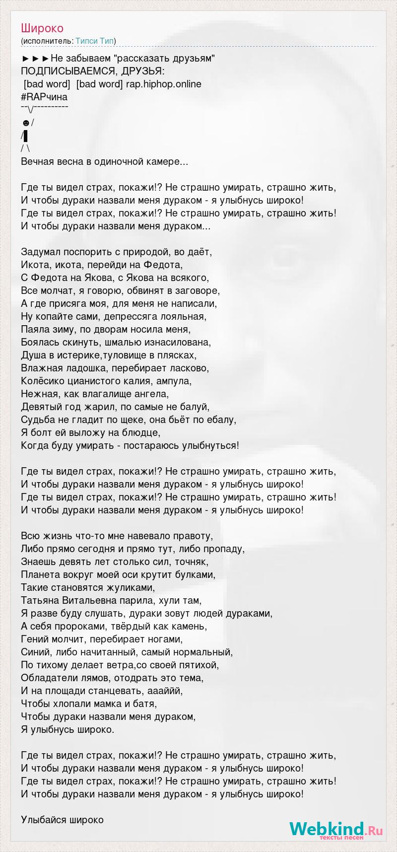 ►►►Не забываем "рассказать друзьям" ПОДПИСЫВАЕМСЯ, ДРУЗЬЯ: [bad word] [bad word] rap.hiphop.online #RAРчина ¯¯\/¯¯¯¯¯¯¯¯¯¯ ☻/ /▌ / \ Вечная весна в одиночной камере... Где ты видел страх, покажи!? Не страшно умирать, страшно жить, И чтобы дураки назвали меня дураком - я улыбнусь широко! Где ты видел страх, покажи!? Не страшно умирать, страшно жить! И чтобы дураки назвали меня дураком... Задумал поспорить с природой, во даёт, Икота, икота, перейди на Федота, С Федота на Якова, с Якова на всякого, Все молчат, я говорю, обвинят в заговоре, А где присяга моя, для меня не написали, Ну копайте сами, депрессяга лояльная, Паяла зиму, по дворам носила меня, Боялась скинуть, шмалью изнасилована, Душа в истерике,туловище в плясках, Влажная ладошка, перебирает ласково, Колёсико цианистого калия, ампула, Нежная, как влагалище ангела, Девятый год жарил, по самые не балуй, Судьба не гладит по щеке, она бьёт по ебалу, Я болт ей выложу на блюдце, Когда буду умирать - постараюсь улыбнуться! Где ты видел страх, покажи!? Не страшно умирать, страшно жить, И чтобы дураки назвали меня дураком - я улыбнусь широко! Где ты видел страх, покажи!? Не страшно умирать, страшно жить! И чтобы дураки назвали меня дураком - я улыбнусь широко! Всю жизнь что-то мне навевало правоту, Либо прямо сегодня и прямо тут, либо пропаду, Знаешь девять лет столько сил, точняк, Планета вокруг моей оси крутит булками, Такие становятся жуликами, Татьяна Витальевна парила, хули там, Я разве буду слушать, дураки зовут людей дураками, А себя пророками, твёрдый как камень, Гений молчит, перебирает ногами, Синий, либо начитанный, самый нормальный, По тихому делает ветра,со своей пятихой, Обладатели лямов, отодрать это тема, И на площади станцевать, аааййй, Чтобы хлопали мамка и батя, Чтобы дураки назвали меня дураком, Я улыбнусь широко. Где ты видел страх, покажи!? Не страшно умирать, страшно жить, И чтобы дураки назвали меня дураком - я улыбнусь широко! Где ты видел страх, покажи!? Не страшно умирать, страшно жить! И чтобы дураки назвали меня дураком - я улыбнусь широко! Улыбайся широко