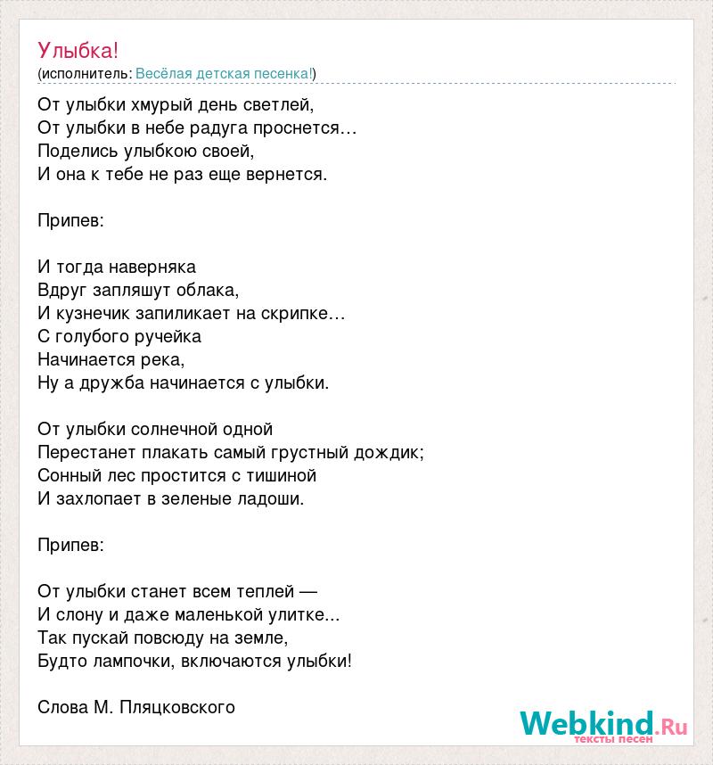 От улыбки хмурый день светлей, От улыбки в небе радуга проснется… Поделись улыбкою своей, И она к тебе не раз еще вернется. Припев: И тогда наверняка Вдруг запляшут облака, И кузнечик запиликает на скрипке… С голубого ручейка Начинается река, Ну а дружба начинается с улыбки. От улыбки солнечной одной Перестанет плакать самый грустный дождик; Сонный лес простится с тишиной И захлопает в зеленые ладоши. Припев: От улыбки станет всем теплей — И слону и даже маленькой улитке... Так пускай повсюду на земле, Будто лампочки, включаются улыбки! Слова М. Пляцковского