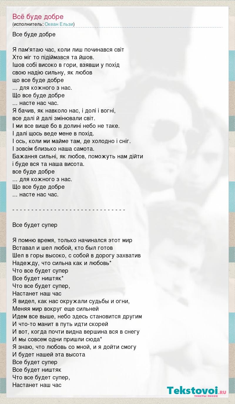 Все буде добре Я пам'ятаю час, коли лиш починався світ Хто міг то підіймався та йшов. Ішов собі високо в гори, взявши у похід свою надію сильну, як любов що все буде добре ... для кожного з нас. Що все буде добре ... насте нас час. Я бачив, як навколо нас, і долі і вогні, все далі й далі змінювали світ. І ми все вище бо в долині небо не таке. І далі щось веде мене в похід. І ось, коли ми майме там, де холодно і сніг. І зовсім близько наша самота. Бажання сильні, як любов, поможуть нам дійти і буде вся та наша висота. все буде добре ... для кожного з нас. Що все буде добре ... насте нас час. - - - - - - - - - - - - - - - - - - - - - - - - - - - - - - Все будет супер Я помню время, только начинался этот мир Вставал и шел любой, кто был готов Шел в горы высоко, с собой в дорогу захватив Надежду, что сильна как и любовь* Что все будет супер Все будет ништяк* Что все будет супер, Настанет наш час Я видел, как нас окружали судьбы и огни, Меняя мир вокруг еще сильней Идем все выше, небо здесь становится другим И что-то манит в путь идти скорей И вот, когда почти видна вершина вся в снегу И мы совсем одни пришли сюда* Я знаю, что любовь со мной, и я дойти смогу И будет нашей эта высота Все будет супер Все будет ништяк Что все будет супер, Настанет наш час