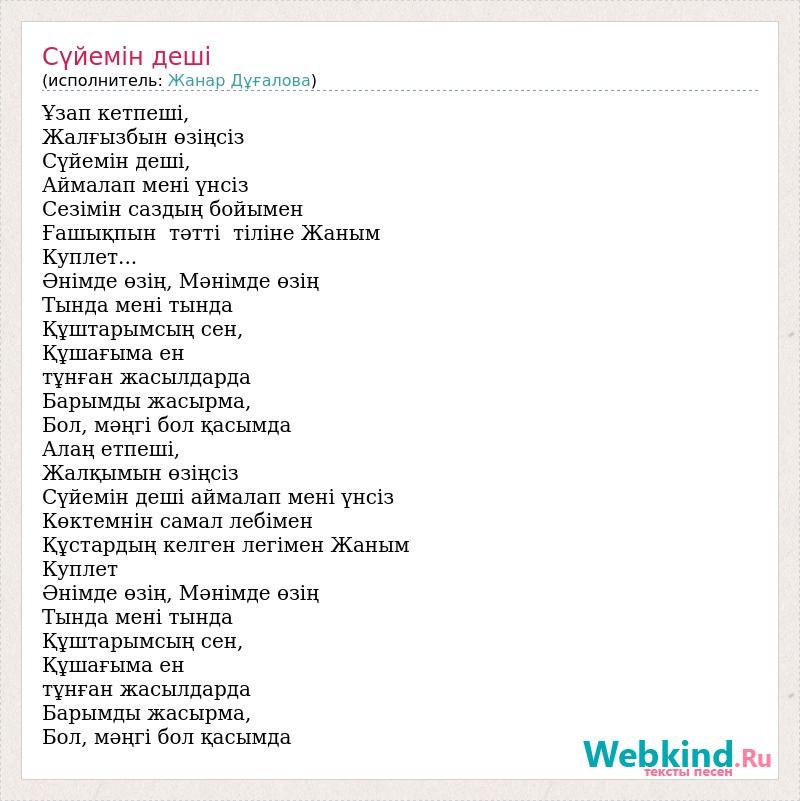 Ұзап кетпеші, Жалғызбын өзіңсіз Сүйемін деші, Аймалап мені үнсіз Сезімін саздың бойымен Ғашықпын тәтті тіліне Жаным Куплет... Әнімде өзің, Мәнімде өзің Тында мені тында Құштарымсың сен, Құшағыма ен тұнған жасылдарда Барымды жасырма, Бол, мәңгі бол қасымда Алаң етпеші, Жалқымын өзіңсіз Сүйемін деші аймалап мені үнсіз Көктемнін самал лебімен Құстардың келген легімен Жаным Куплет Әнімде өзің, Мәнімде өзің Тында мені тында Құштарымсың сен, Құшағыма ен тұнған жасылдарда Барымды жасырма, Бол, мәңгі бол қасымда