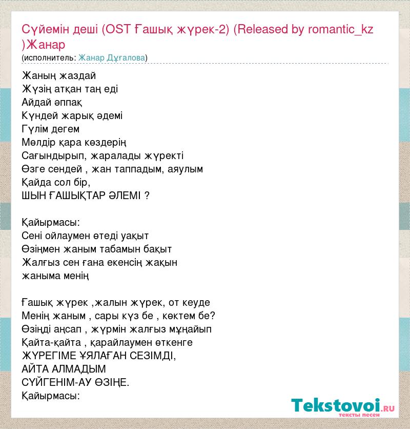 Жаның жаздай Жүзің атқан таң еді Айдай әппақ Күндей жарық әдемі Гүлім дегем Мөлдір қара көздерің Сағындырып, жаралады жүректі Өзге сендей , жан таппадым, аяулым Қайда сол бір, ШЫН ҒАШЫҚТАР ӘЛЕМІ ? Қайырмасы: Сені ойлаумен өтеді уақыт Өзіңмен жаным табамын бақыт Жалғыз сен ғана екенсің жақын жаныма менің Ғашық жүрек ,жалын жүрек, от кеуде Менің жаным , сары күз бе , көктем бе? Өзіңді аңсап , жүрмін жалғыз мұңайып Қайта-қайта , қарайлаумен өткенге ЖҮРЕГІМЕ ҰЯЛАҒАН СЕЗІМДІ, АЙТА АЛМАДЫМ СҮЙГЕНІМ-АУ ӨЗІҢЕ. Қайырмасы: