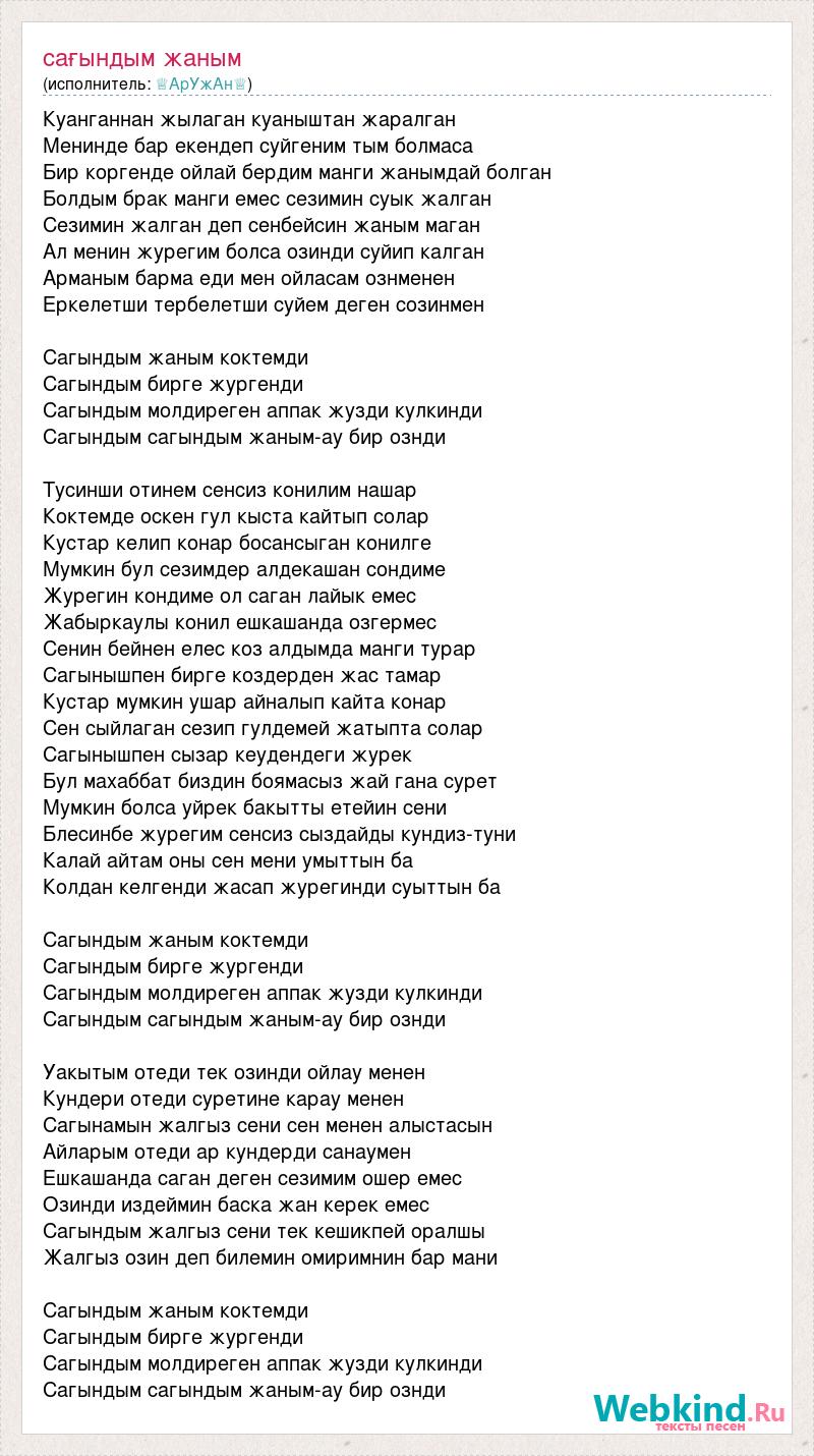 Куанганнан жылаган куаныштан жаралган Менинде бар екендеп суйгеним тым болмаса Бир коргенде ойлай бердим манги жанымдай болган Болдым брак манги емес сезимин суык жалган Сезимин жалган деп сенбейсин жаным маган Ал менин журегим болса озинди суйип калган Арманым барма еди мен ойласам ознменен Еркелетши тербелетши суйем деген созинмен Сагындым жаным коктемди Сагындым бирге жургенди Сагындым молдиреген аппак жузди кулкинди Сагындым сагындым жаным-ау бир ознди Тусинши отинем сенсиз конилим нашар Коктемде оскен гул кыста кайтып солар Кустар келип конар босансыган конилге Мумкин бул сезимдер алдекашан сондиме Журегин кондиме ол саган лайык емес Жабыркаулы конил ешкашанда озгермес Сенин бейнен елес коз алдымда манги турар Сагынышпен бирге коздерден жас тамар Кустар мумкин ушар айналып кайта конар Сен сыйлаган сезип гулдемей жатыпта солар Сагынышпен сызар кеудендеги журек Бул махаббат биздин боямасыз жай гана сурет Мумкин болса уйрек бакытты етейин сени Блесинбе журегим сенсиз сыздайды кундиз-туни Калай айтам оны сен мени умыттын ба Колдан келгенди жасап журегинди суыттын ба Сагындым жаным коктемди Сагындым бирге жургенди Сагындым молдиреген аппак жузди кулкинди Сагындым сагындым жаным-ау бир ознди Уакытым отеди тек озинди ойлау менен Кундери отеди суретине карау менен Сагынамын жалгыз сени сен менен алыстасын Айларым отеди ар кундерди санаумен Ешкашанда саган деген сезимим ошер емес Озинди издеймин баска жан керек емес Сагындым жалгыз сени тек кешикпей оралшы Жалгыз озин деп билемин омиримнин бар мани Сагындым жаным коктемди Сагындым бирге жургенди Сагындым молдиреген аппак жузди кулкинди Сагындым сагындым жаным-ау бир ознди
