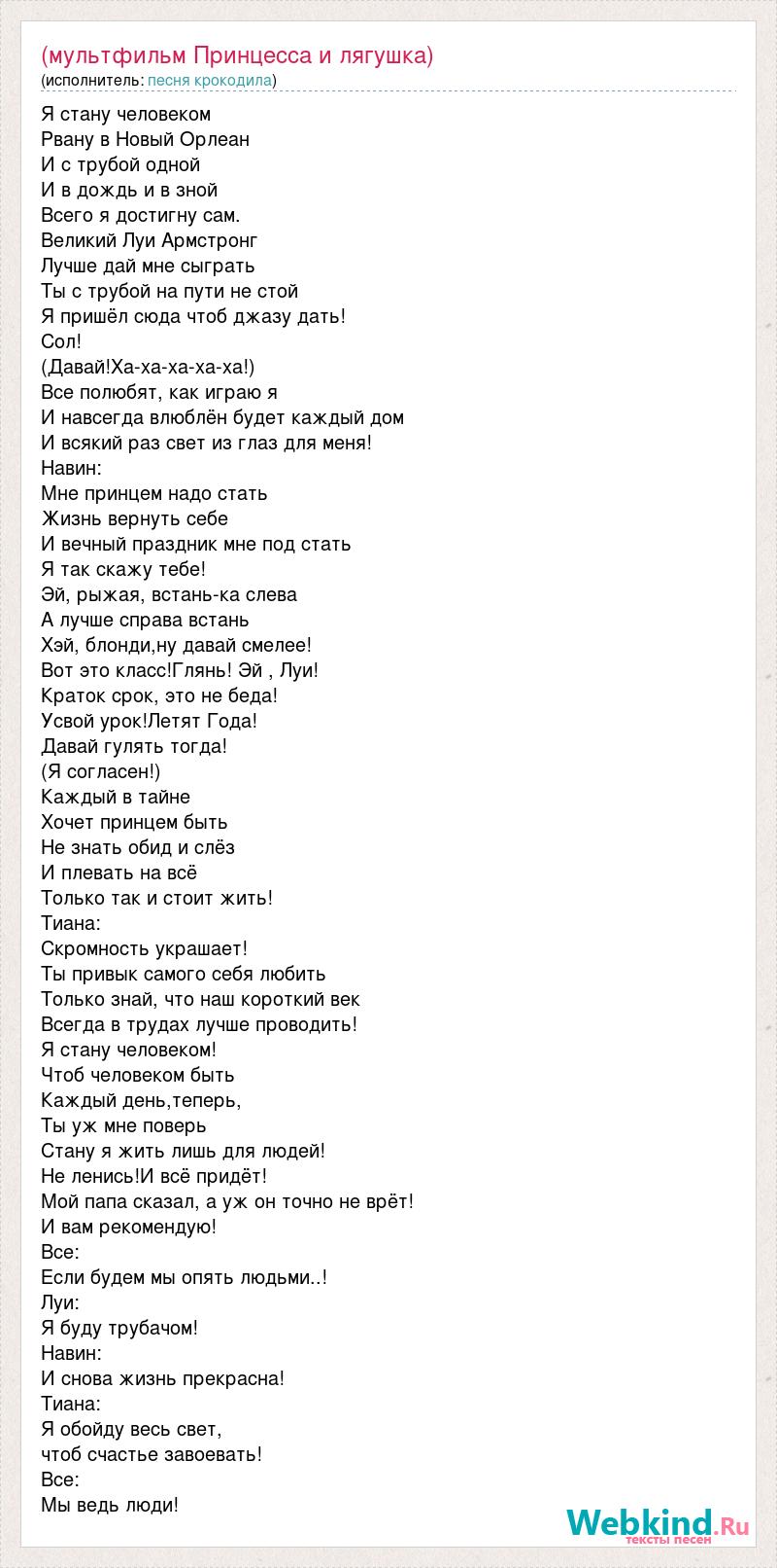 Я стану человеком Рвану в Новый Орлеан И с трубой одной И в дождь и в зной Всего я достигну сам. Великий Луи Армстронг Лучше дай мне сыграть Ты с трубой на пути не стой Я пришёл сюда чтоб джазу дать! Сол! (Давай!Ха-ха-ха-ха-ха!) Все полюбят, как играю я И навсегда влюблён будет каждый дом И всякий раз свет из глаз для меня! Навин: Мне принцем надо стать Жизнь вернуть себе И вечный праздник мне под стать Я так скажу тебе! Эй, рыжая, встань-ка слева А лучше справа встань Хэй, блонди,ну давай смелее! Вот это класс!Глянь! Эй , Луи! Краток срок, это не беда! Усвой урок!Летят Года! Давай гулять тогда! (Я согласен!) Каждый в тайне Хочет принцем быть Не знать обид и слёз И плевать на всё Только так и стоит жить! Тиана: Скромность украшает! Ты привык самого себя любить Только знай, что наш короткий век Всегда в трудах лучше проводить! Я стану человеком! Чтоб человеком быть Каждый день,теперь, Ты уж мне поверь Стану я жить лишь для людей! Не ленись!И всё придёт! Мой папа сказал, а уж он точно не врёт! И вам рекомендую! Все: Если будем мы опять людьми..! Луи: Я буду трубачом! Навин: И снова жизнь прекрасна! Тиана: Я обойду весь свет, чтоб счастье завоевать! Все: Мы ведь люди!