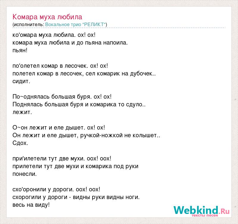 ко'омара муха любила. ох! ох! комара муха любила и до пьяна напоила. пьян! по'олетел комар в лесочек. ох! ох! полетел комар в лесочек, сел комарик на дубочек.. сидит. По~однялась большая буря. ох! ох! Поднялась большая буря и комарика то сдуло.. лежит. О~он лежит и еле дышет. ох! ох! Он лежит и еле дышет, ручкой-ножкой не колышет.. Сдох. при'илетели тут две мухи. оох! оох! прилетели тут две мухи и комарика под руки понесли. схо'оронили у дороги. оох! оох! схорогили у дороги - видны руки видны ноги. весь на виду!