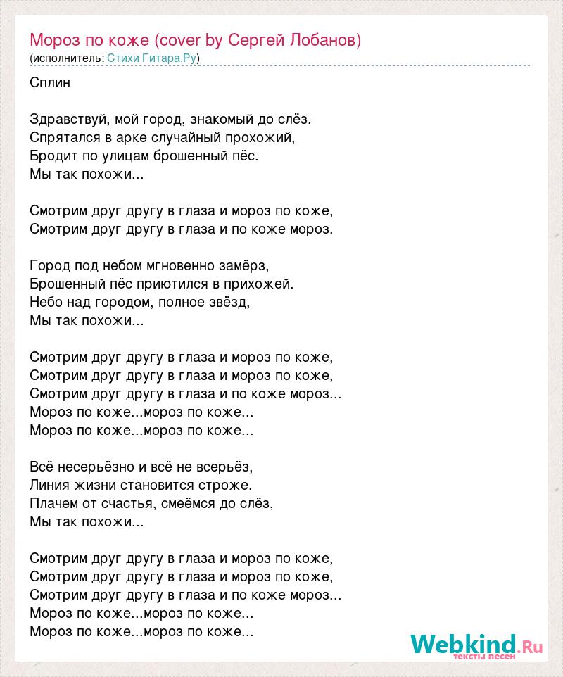 Сплин Здравствуй, мой город, знакомый до слёз. Спрятался в арке случайный прохожий, Бродит по улицам брошенный пёс. Мы так похожи... Смотрим друг другу в глаза и мороз по коже, Смотрим друг другу в глаза и по коже мороз. Город под небом мгновенно замёрз, Брошенный пёс приютился в прихожей. Небо над городом, полное звёзд, Мы так похожи... Смотрим друг другу в глаза и мороз по коже, Смотрим друг другу в глаза и мороз по коже, Смотрим друг другу в глаза и по коже мороз... Мороз по коже...мороз по коже... Мороз по коже...мороз по коже... Всё несерьёзно и всё не всерьёз, Линия жизни становится строже. Плачем от счастья, смеёмся до слёз, Мы так похожи... Смотрим друг другу в глаза и мороз по коже, Смотрим друг другу в глаза и мороз по коже, Смотрим друг другу в глаза и по коже мороз... Мороз по коже...мороз по коже... Мороз по коже...мороз по коже...