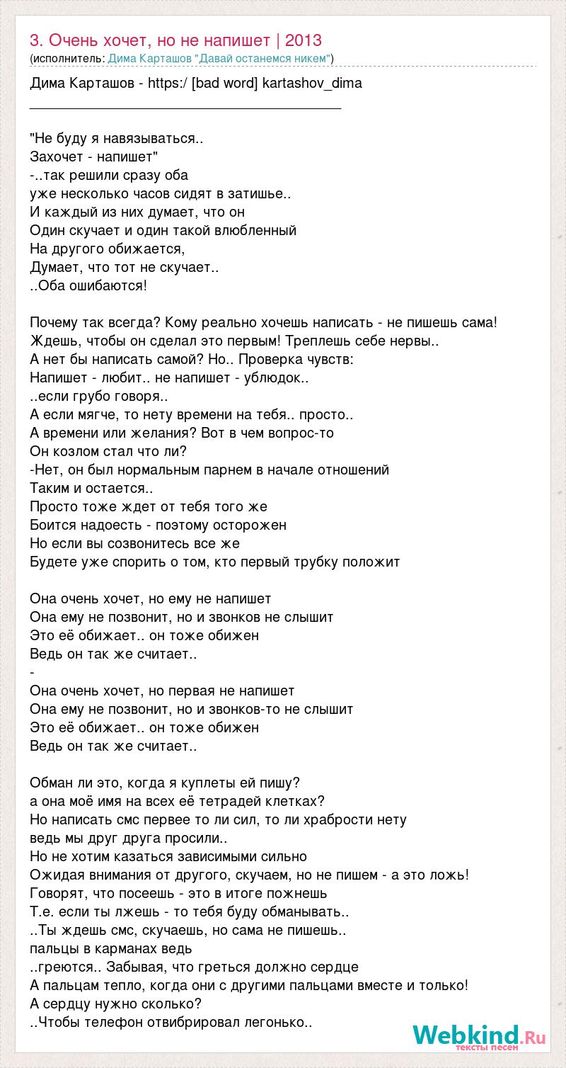 Дима Карташов - https:/ [bad word] kartashov_dima ________________________________________ "Не буду я навязываться.. Захочет - напишет" -..так решили сразу оба уже несколько часов сидят в затишье.. И каждый из них думает, что он Один скучает и один такой влюбленный На другого обижается, Думает, что тот не скучает.. ..Оба ошибаются! Почему так всегда? Кому реально хочешь написать - не пишешь сама! Ждешь, чтобы он сделал это первым! Треплешь себе нервы.. А нет бы написать самой? Но.. Проверка чувств: Напишет - любит.. не напишет - ублюдок.. ..если грубо говоря.. А если мягче, то нету времени на тебя.. просто.. А времени или желания? Вот в чем вопрос-то Он козлом стал что ли? -Нет, он был нормальным парнем в начале отношений Таким и остается.. Просто тоже ждет от тебя того же Боится надоесть - поэтому осторожен Но если вы созвонитесь все же Будете уже спорить о том, кто первый трубку положит Она очень хочет, но ему не напишет Она ему не позвонит, но и звонков не слышит Это её обижает.. он тоже обижен Ведь он так же считает.. - Она очень хочет, но первая не напишет Она ему не позвонит, но и звонков-то не слышит Это её обижает.. он тоже обижен Ведь он так же считает.. Обман ли это, когда я куплеты ей пишу? а она моё имя на всех её тетрадей клетках? Но написать смс первее то ли сил, то ли храбрости нету ведь мы друг друга просили.. Но не хотим казаться зависимыми сильно Ожидая внимания от другого, скучаем, но не пишем - а это ложь! Говорят, что посеешь - это в итоге пожнешь Т.е. если ты лжешь - то тебя буду обманывать.. ..Ты ждешь смс, скучаешь, но сама не пишешь.. пальцы в карманах ведь ..греются.. Забывая, что греться должно сердце А пальцам тепло, когда они с другими пальцами вместе и только! А сердцу нужно сколько? ..Чтобы телефон отвибрировал легонько..