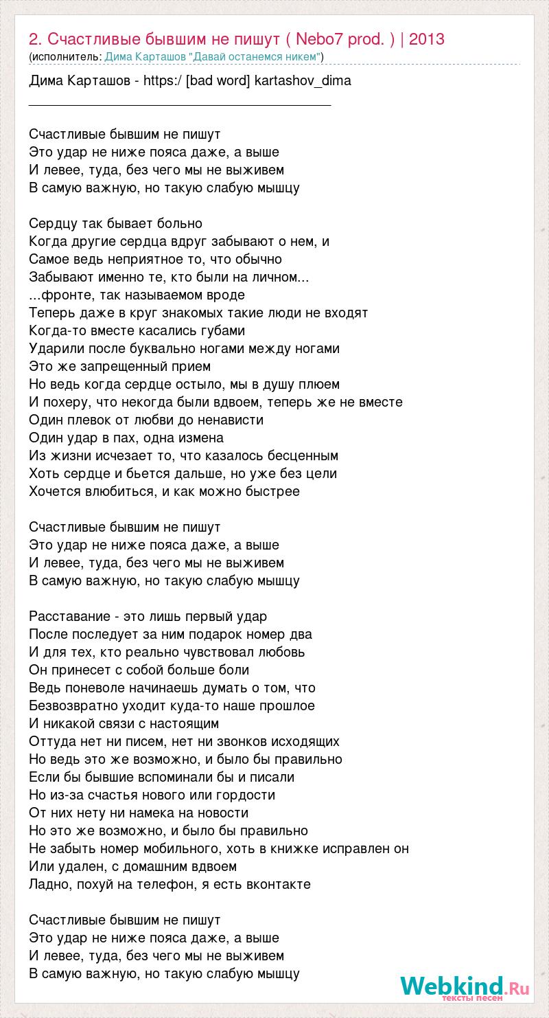 Дима Карташов - https:/ [bad word] kartashov_dima ________________________________________ Счастливые бывшим не пишут Это удар не ниже пояса даже, а выше И левее, туда, без чего мы не выживем В самую важную, но такую слабую мышцу Сердцу так бывает больно Когда другие сердца вдруг забывают о нем, и Самое ведь неприятное то, что обычно Забывают именно те, кто были на личном... ...фронте, так называемом вроде Теперь даже в круг знакомых такие люди не входят Когда-то вместе касались губами Ударили после буквально ногами между ногами Это же запрещенный прием Но ведь когда сердце остыло, мы в душу плюем И похеру, что некогда были вдвоем, теперь же не вместе Один плевок от любви до ненависти Один удар в пах, одна измена Из жизни исчезает то, что казалось бесценным Хоть сердце и бьется дальше, но уже без цели Хочется влюбиться, и как можно быстрее Счастливые бывшим не пишут Это удар не ниже пояса даже, а выше И левее, туда, без чего мы не выживем В самую важную, но такую слабую мышцу Расставание - это лишь первый удар После последует за ним подарок номер два И для тех, кто реально чувствовал любовь Он принесет с собой больше боли Ведь поневоле начинаешь думать о том, что Безвозвратно уходит куда-то наше прошлое И никакой связи с настоящим Оттуда нет ни писем, нет ни звонков исходящих Но ведь это же возможно, и было бы правильно Если бы бывшие вспоминали бы и писали Но из-за счастья нового или гордости От них нету ни намека на новости Но это же возможно, и было бы правильно Не забыть номер мобильного, хоть в книжке исправлен он Или удален, с домашним вдвоем Ладно, похуй на телефон, я есть вконтакте Счастливые бывшим не пишут Это удар не ниже пояса даже, а выше И левее, туда, без чего мы не выживем В самую важную, но такую слабую мышцу