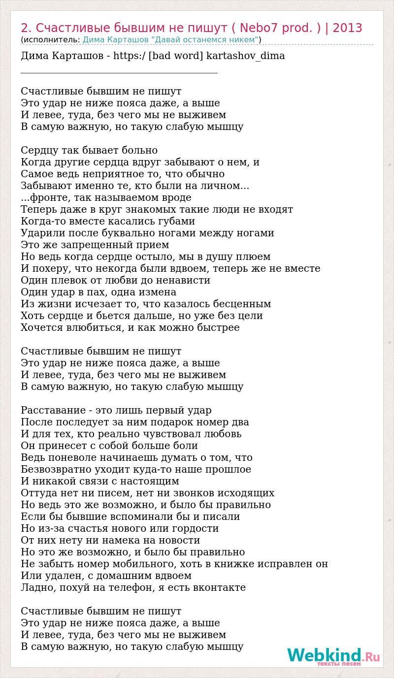 Дима Карташов - https:/ [bad word] kartashov_dima ________________________________________ Счастливые бывшим не пишут Это удар не ниже пояса даже, а выше И левее, туда, без чего мы не выживем В самую важную, но такую слабую мышцу Сердцу так бывает больно Когда другие сердца вдруг забывают о нем, и Самое ведь неприятное то, что обычно Забывают именно те, кто были на личном... ...фронте, так называемом вроде Теперь даже в круг знакомых такие люди не входят Когда-то вместе касались губами Ударили после буквально ногами между ногами Это же запрещенный прием Но ведь когда сердце остыло, мы в душу плюем И похеру, что некогда были вдвоем, теперь же не вместе Один плевок от любви до ненависти Один удар в пах, одна измена Из жизни исчезает то, что казалось бесценным Хоть сердце и бьется дальше, но уже без цели Хочется влюбиться, и как можно быстрее Счастливые бывшим не пишут Это удар не ниже пояса даже, а выше И левее, туда, без чего мы не выживем В самую важную, но такую слабую мышцу Расставание - это лишь первый удар После последует за ним подарок номер два И для тех, кто реально чувствовал любовь Он принесет с собой больше боли Ведь поневоле начинаешь думать о том, что Безвозвратно уходит куда-то наше прошлое И никакой связи с настоящим Оттуда нет ни писем, нет ни звонков исходящих Но ведь это же возможно, и было бы правильно Если бы бывшие вспоминали бы и писали Но из-за счастья нового или гордости От них нету ни намека на новости Но это же возможно, и было бы правильно Не забыть номер мобильного, хоть в книжке исправлен он Или удален, с домашним вдвоем Ладно, похуй на телефон, я есть вконтакте Счастливые бывшим не пишут Это удар не ниже пояса даже, а выше И левее, туда, без чего мы не выживем В самую важную, но такую слабую мышцу