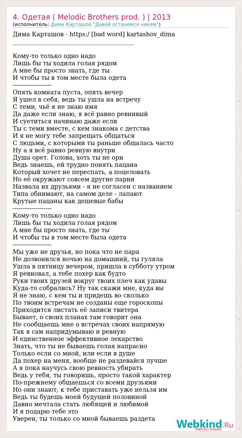Дима Карташов - https:/ [bad word] kartashov_dima ________________________________________ Кому-то только одно надо Лишь бы ты ходила голая рядом А мне бы просто знать, где ты И чтобы ты в том месте была одета ------------------- Опять комната пуста, опять вечер Я ушел в себя, ведь ты ушла на встречу С теми, чьё я не знаю имя Да даже если знаю, я всё равно ревнивый И суетиться начинаю даже если Ты с теми вместе, с кем знакома с детства И я не могу тебе запрещать общаться С людьми, с которыми ты раньше общалась часто Ну а я всё равно ревную внутри Душа орет. Голова, хоть ты не ори Ведь знаешь, ей трудно понять пацана Который хочет не переспать, а поцеловать Но её окружают совсем другие парни Назвала их друзьями - я не согласен с названием Типа обнимают, на самом деле - лапают Крутые пацаны как дешевые бабы ------------------- Кому-то только одно надо Лишь бы ты ходила голая рядом А мне бы просто знать, где ты И чтобы ты в том месте была одета ------------------- Мы уже не друзья, но пока что не пара Не дозвонился ночью на домашний, ты гуляла Ушла в пятницу вечером, пришла в субботу утром Я ревновал, а тебе похер как будто Руки твоих друзей вокруг твоих плеч как удавы Куда-то собрались? Ну так скажи мне, куда вы Я не знаю, с кем ты и придешь во сколько По твоим встречам не созданы еще гороскопы Приходится листать её записи твитера Бывает, о своих планах там говорит она Не сообщаешь мне о встречах своих напрямую Так я сам напридумываю и ревную И единственное эффективное лекарство Знать, что ты не бываешь голая напрасно Только если со мной, или если в душе Да похер на меня, вообще не раздевайся лучше А я пока научусь свою ревность убирать Ведь у тебя, ты говоришь, просто такой характер По-прежнему общаешься со всеми друзьями Но они знают, к тебе приставать уже нельзя им Ведь ты будешь моей будущей половиной Давно мечтала стать любящей и любимой И я подарю тебе это Уверен, ты только со мной бываешь раздета