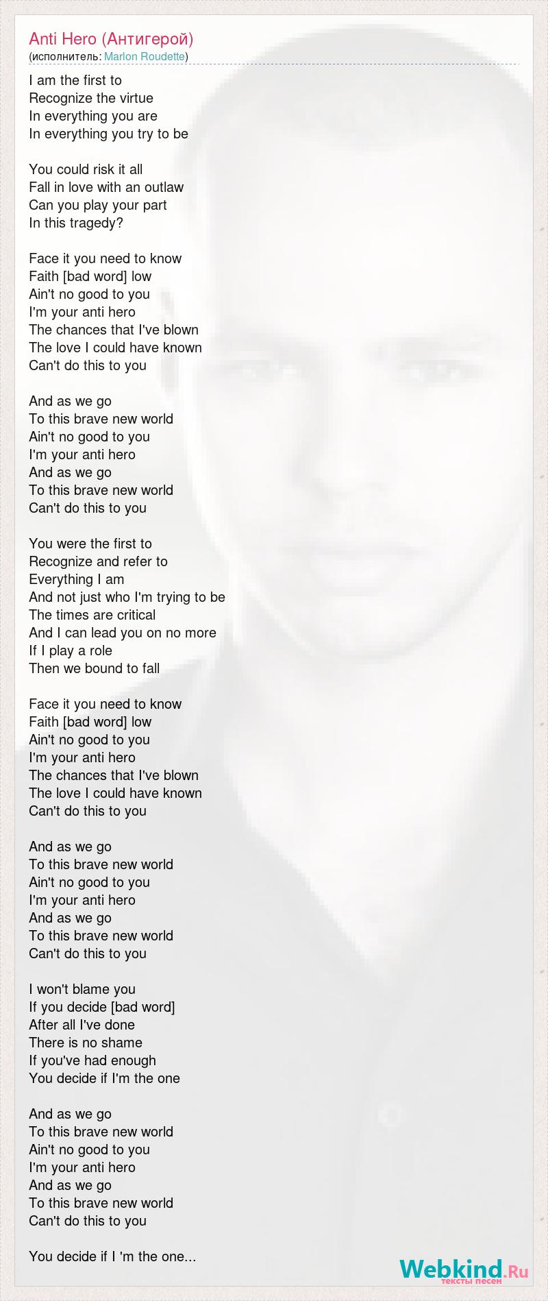 I am the first to Recognize the virtue In everything you are In everything you try to be You could risk it all Fall in love with an outlaw Can you play your part In this tragedy? Face it you need to know Faith [bad word] low Ain't no good to you I'm your anti hero The chances that I've blown The love I could have known Can't do this to you And as we go To this brave new world Ain't no good to you I'm your anti hero And as we go To this brave new world Can't do this to you You were the first to Recognize and refer to Everything I am And not just who I'm trying to be The times are critical And I can lead you on no more If I play a role Then we bound to fall Face it you need to know Faith [bad word] low Ain't no good to you I'm your anti hero The chances that I've blown The love I could have known Can't do this to you And as we go To this brave new world Ain't no good to you I'm your anti hero And as we go To this brave new world Can't do this to you I won't blame you If you decide [bad word] After all I've done There is no shame If you've had enough You decide if I'm the one And as we go To this brave new world Ain't no good to you I'm your anti hero And as we go To this brave new world Can't do this to you You decide if I 'm the one...