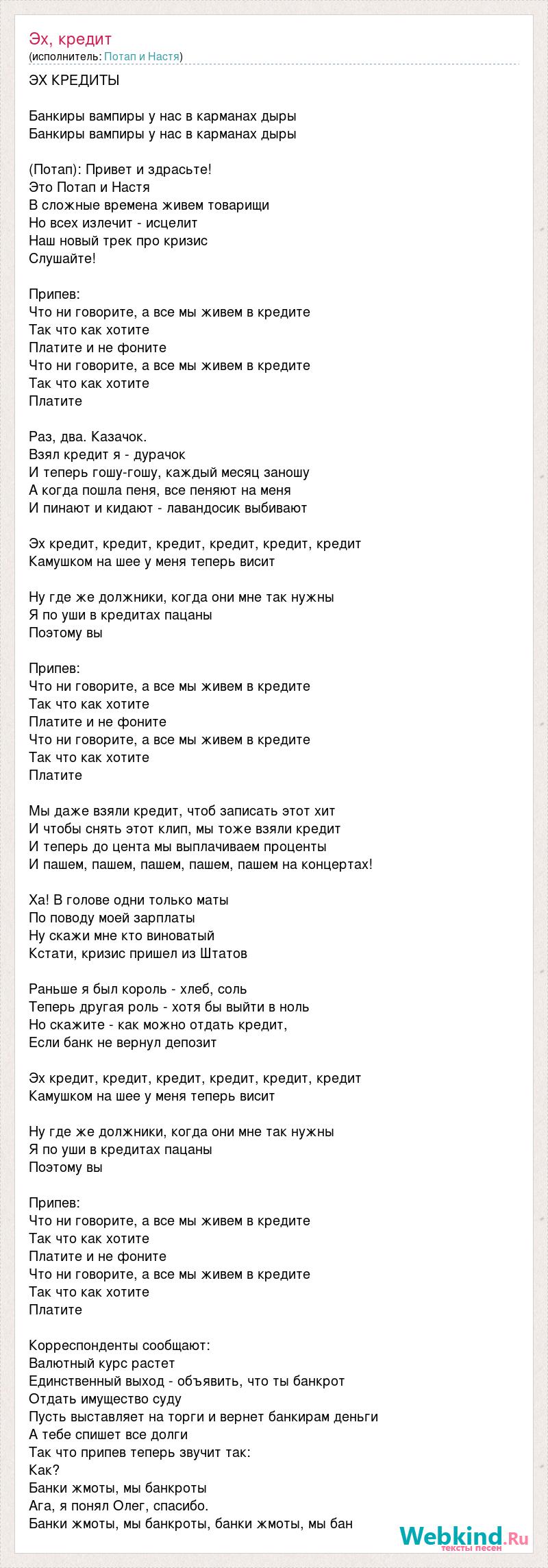 ЭХ КРЕДИТЫ Банкиры вампиры у нас в карманах дыры Банкиры вампиры у нас в карманах дыры (Потап): Привет и здрасьте! Это Потап и Настя В сложные времена живем товарищи Но всех излечит - исцелит Наш новый трек про кризис Слушайте! Припев: Что ни говорите, а все мы живем в кредите Так что как хотите Платите и не фоните Что ни говорите, а все мы живем в кредите Так что как хотите Платите Раз, два. Казачок. Взял кредит я - дурачок И теперь гошу-гошу, каждый месяц заношу А когда пошла пеня, все пеняют на меня И пинают и кидают - лавандосик выбивают Эх кредит, кредит, кредит, кредит, кредит, кредит Камушком на шее у меня теперь висит Ну где же должники, когда они мне так нужны Я по уши в кредитах пацаны Поэтому вы Припев: Что ни говорите, а все мы живем в кредите Так что как хотите Платите и не фоните Что ни говорите, а все мы живем в кредите Так что как хотите Платите Мы даже взяли кредит, чтоб записать этот хит И чтобы снять этот клип, мы тоже взяли кредит И теперь до цента мы выплачиваем проценты И пашем, пашем, пашем, пашем, пашем на концертах! Ха! В голове одни только маты По поводу моей зарплаты Ну скажи мне кто виноватый Кстати, кризис пришел из Штатов Раньше я был король - хлеб, соль Теперь другая роль - хотя бы выйти в ноль Но скажите - как можно отдать кредит, Если банк не вернул депозит Эх кредит, кредит, кредит, кредит, кредит, кредит Камушком на шее у меня теперь висит Ну где же должники, когда они мне так нужны Я по уши в кредитах пацаны Поэтому вы Припев: Что ни говорите, а все мы живем в кредите Так что как хотите Платите и не фоните Что ни говорите, а все мы живем в кредите Так что как хотите Платите Корреспонденты сообщают: Валютный курс растет Единственный выход - объявить, что ты банкрот Отдать имущество суду Пусть выставляет на торги и вернет банкирам деньги А тебе спишет все долги Так что припев теперь звучит так: Как? Банки жмоты, мы банкроты Ага, я понял Олег, спасибо. Банки жмоты, мы банкроты, банки жмоты, мы бан