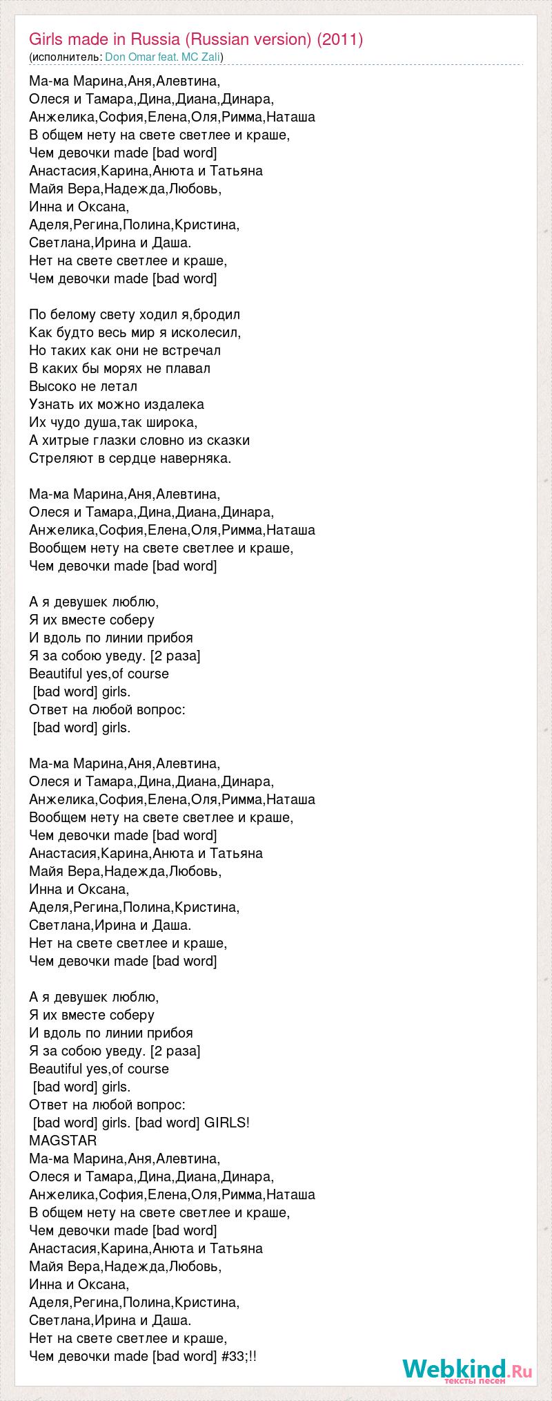 Ма-ма Марина,Аня,Алевтина, Олеся и Тамара,Дина,Диана,Динара, Анжелика,София,Елена,Оля,Римма,Наташа В общем нету на свете светлее и краше, Чем девочки made [bad word] Анастасия,Карина,Анюта и Татьяна Майя Вера,Надежда,Любовь, Инна и Оксана, Аделя,Регина,Полина,Кристина, Светлана,Ирина и Даша. Нет на свете светлее и краше, Чем девочки made [bad word] По белому свету ходил я,бродил Как будто весь мир я исколесил, Но таких как они не встречал В каких бы морях не плавал Высоко не летал Узнать их можно издалека Их чудо душа,так широка, А хитрые глазки словно из сказки Стреляют в сердце наверняка. Ма-ма Марина,Аня,Алевтина, Олеся и Тамара,Дина,Диана,Динара, Анжелика,София,Елена,Оля,Римма,Наташа Вообщем нету на свете светлее и краше, Чем девочки made [bad word] А я девушек люблю, Я их вместе соберу И вдоль по линии прибоя Я за собою уведу. [2 раза] Beautiful yes,of course [bad word] girls. Ответ на любой вопрос: [bad word] girls. Ма-ма Марина,Аня,Алевтина, Олеся и Тамара,Дина,Диана,Динара, Анжелика,София,Елена,Оля,Римма,Наташа Вообщем нету на свете светлее и краше, Чем девочки made [bad word] Анастасия,Карина,Анюта и Татьяна Майя Вера,Надежда,Любовь, Инна и Оксана, Аделя,Регина,Полина,Кристина, Светлана,Ирина и Даша. Нет на свете светлее и краше, Чем девочки made [bad word] А я девушек люблю, Я их вместе соберу И вдоль по линии прибоя Я за собою уведу. [2 раза] Beautiful yes,of course [bad word] girls. Ответ на любой вопрос: [bad word] girls. [bad word] GIRLS! MAGSTAR Ма-ма Марина,Аня,Алевтина, Олеся и Тамара,Дина,Диана,Динара, Анжелика,София,Елена,Оля,Римма,Наташа В общем нету на свете светлее и краше, Чем девочки made [bad word] Анастасия,Карина,Анюта и Татьяна Майя Вера,Надежда,Любовь, Инна и Оксана, Аделя,Регина,Полина,Кристина, Светлана,Ирина и Даша. Нет на свете светлее и краше, Чем девочки made [bad word] #33;!!