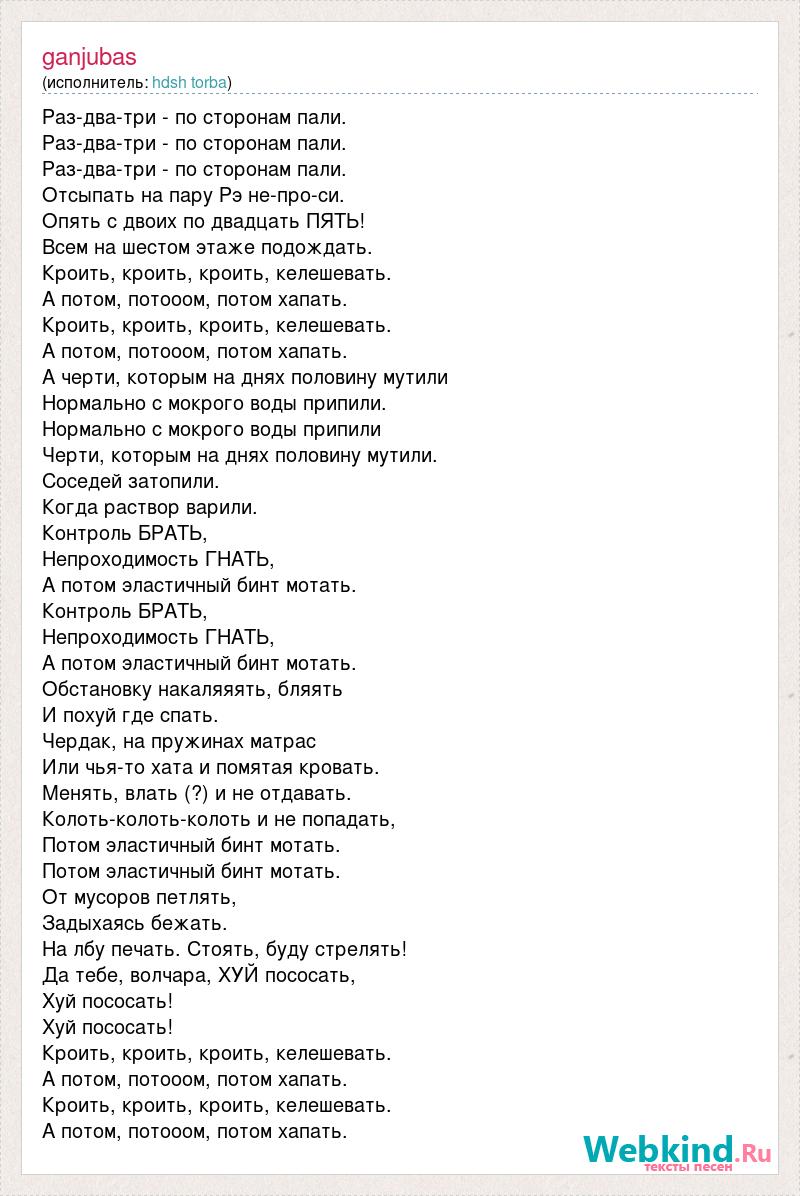 Раз-два-три - по сторонам пали. Раз-два-три - по сторонам пали. Раз-два-три - по сторонам пали. Отсыпать на пару Рэ не-про-си. Опять с двоих по двадцать ПЯТЬ! Всем на шестом этаже подождать. Кроить, кроить, кроить, келешевать. А потом, потооом, потом хапать. Кроить, кроить, кроить, келешевать. А потом, потооом, потом хапать. А черти, которым на днях половину мутили Нормально с мокрого воды припили. Нормально с мокрого воды припили Черти, которым на днях половину мутили. Соседей затопили. Когда раствор варили. Контроль БРАТЬ, Непроходимость ГНАТЬ, А потом эластичный бинт мотать. Контроль БРАТЬ, Непроходимость ГНАТЬ, А потом эластичный бинт мотать. Обстановку накаляяять, бляять И похуй где спать. Чердак, на пружинах матрас Или чья-то хата и помятая кровать. Менять, влать (?) и не отдавать. Колоть-колоть-колоть и не попадать, Потом эластичный бинт мотать. Потом эластичный бинт мотать. От мусоров петлять, Задыхаясь бежать. На лбу печать. Стоять, буду стрелять! Да тебе, волчара, ХУЙ пососать, Хуй пососать! Хуй пососать! Кроить, кроить, кроить, келешевать. А потом, потооом, потом хапать. Кроить, кроить, кроить, келешевать. А потом, потооом, потом хапать.