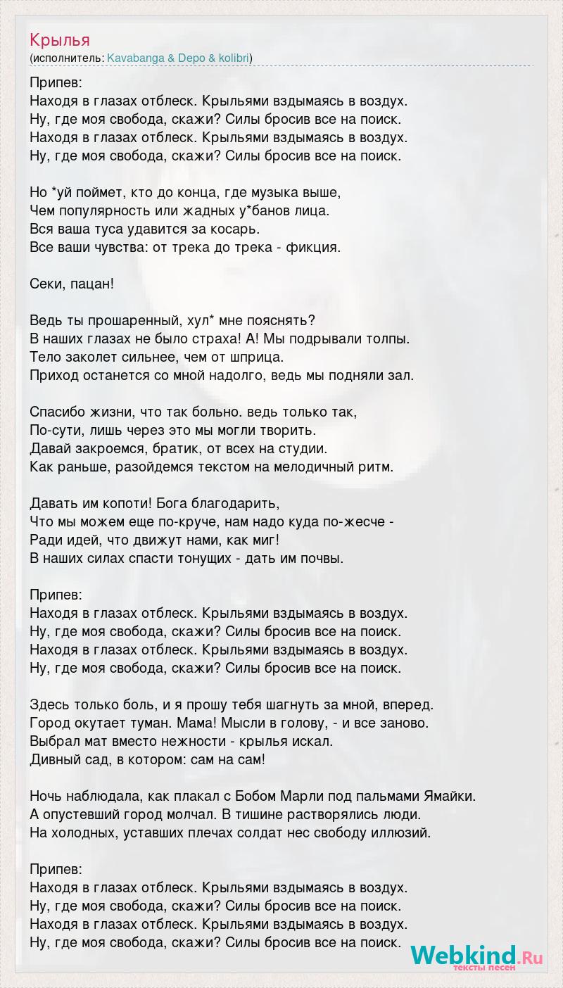 Припев: Находя в глазах отблеск. Крыльями вздымаясь в воздух. Ну, где моя свобода, скажи? Силы бросив все на поиск. Находя в глазах отблеск. Крыльями вздымаясь в воздух. Ну, где моя свобода, скажи? Силы бросив все на поиск. Но *уй поймет, кто до конца, где музыка выше, Чем популярность или жадных у*банов лица. Вся ваша туса удавится за косарь. Все ваши чувства: от трека до трека - фикция. Секи, пацан! Ведь ты прошаренный, хул* мне пояснять? В наших глазах не было страха! А! Мы подрывали толпы. Тело заколет сильнее, чем от шприца. Приход останется со мной надолго, ведь мы подняли зал. Спасибо жизни, что так больно. ведь только так, По-сути, лишь через это мы могли творить. Давай закроемся, братик, от всех на студии. Как раньше, разойдемся текстом на мелодичный ритм. Давать им копоти! Бога благодарить, Что мы можем еще по-круче, нам надо куда по-жесче - Ради идей, что движут нами, как миг! В наших силах спасти тонущих - дать им почвы. Припев: Находя в глазах отблеск. Крыльями вздымаясь в воздух. Ну, где моя свобода, скажи? Силы бросив все на поиск. Находя в глазах отблеск. Крыльями вздымаясь в воздух. Ну, где моя свобода, скажи? Силы бросив все на поиск. Здесь только боль, и я прошу тебя шагнуть за мной, вперед. Город окутает туман. Мама! Мысли в голову, - и все заново. Выбрал мат вместо нежности - крылья искал. Дивный сад, в котором: сам на сам! Ночь наблюдала, как плакал с Бобом Марли под пальмами Ямайки. А опустевший город молчал. В тишине растворялись люди. На холодных, уставших плечах солдат нес свободу иллюзий. Припев: Находя в глазах отблеск. Крыльями вздымаясь в воздух. Ну, где моя свобода, скажи? Силы бросив все на поиск. Находя в глазах отблеск. Крыльями вздымаясь в воздух. Ну, где моя свобода, скажи? Силы бросив все на поиск.