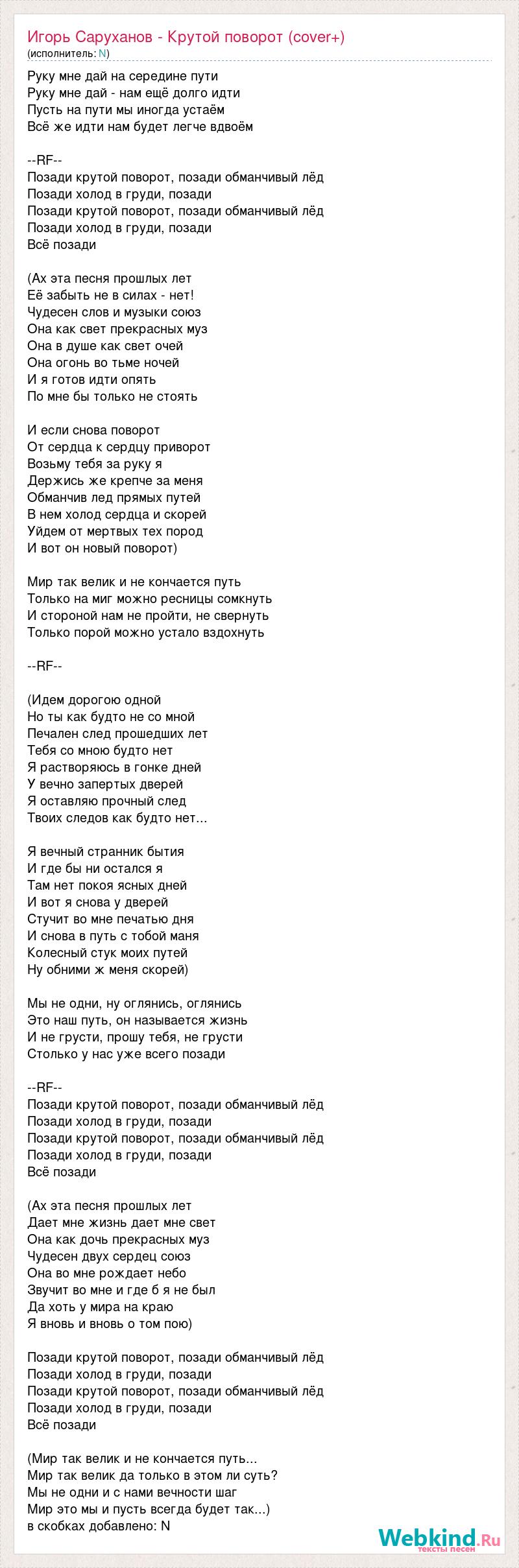 Руку мне дай на середине пути Руку мне дай - нам ещё долго идти Пусть на пути мы иногда устаём Всё же идти нам будет легче вдвоём --RF-- Позади крутой поворот, позади обманчивый лёд Позади холод в груди, позади Позади крутой поворот, позади обманчивый лёд Позади холод в груди, позади Всё позади (Ах эта песня прошлых лет Её забыть не в силах - нет! Чудесен слов и музыки союз Она как свет прекрасных муз Она в душе как свет очей Она огонь во тьме ночей И я готов идти опять По мне бы только не стоять И если снова поворот От сердца к сердцу приворот Возьму тебя за руку я Держись же крепче за меня Обманчив лед прямых путей В нем холод сердца и скорей Уйдем от мертвых тех пород И вот он новый поворот) Мир так велик и не кончается путь Только на миг можно ресницы сомкнуть И стороной нам не пройти, не свернуть Только порой можно устало вздохнуть --RF-- (Идем дорогою одной Но ты как будто не со мной Печален след прошедших лет Тебя со мною будто нет Я растворяюсь в гонке дней У вечно запертых дверей Я оставляю прочный след Твоих следов как будто нет... Я вечный странник бытия И где бы ни остался я Там нет покоя ясных дней И вот я снова у дверей Стучит во мне печатью дня И снова в путь с тобой маня Колесный стук моих путей Ну обними ж меня скорей) Мы не одни, ну оглянись, оглянись Это наш путь, он называется жизнь И не грусти, прошу тебя, не грусти Столько у нас уже всего позади --RF-- Позади крутой поворот, позади обманчивый лёд Позади холод в груди, позади Позади крутой поворот, позади обманчивый лёд Позади холод в груди, позади Всё позади (Ах эта песня прошлых лет Дает мне жизнь дает мне свет Она как дочь прекрасных муз Чудесен двух сердец союз Она во мне рождает небо Звучит во мне и где б я не был Да хоть у мира на краю Я вновь и вновь о том пою) Позади крутой поворот, позади обманчивый лёд Позади холод в груди, позади Позади крутой поворот, позади обманчивый лёд Позади холод в груди, позади Всё позади (Мир так велик и не кончается путь... Мир так велик да только в этом ли суть? Мы не одни и с нами вечности шаг Мир это мы и пусть всегда будет так...) в скобках добавлено: N
