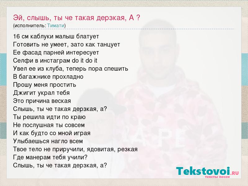 16 см каблуки малыш блатует Готовить не умеет, зато как танцует Ее фасад парней интересует Селфи в инстаграм do it do it Увел ее из клуба, теперь пора спешить В багажнике прохладно Прошу меня простить Джигит украл тебя Это причина веская Слышь, ты че такая дерзкая, а? Ты решила идти по краю Не послушная ты совсем И как будто со мной играя Улыбаешься нагло всем Твое тело не приручили, ядовитая, резкая Где манерам тебя учили? Слышь, ты че такая дерзкая, а?