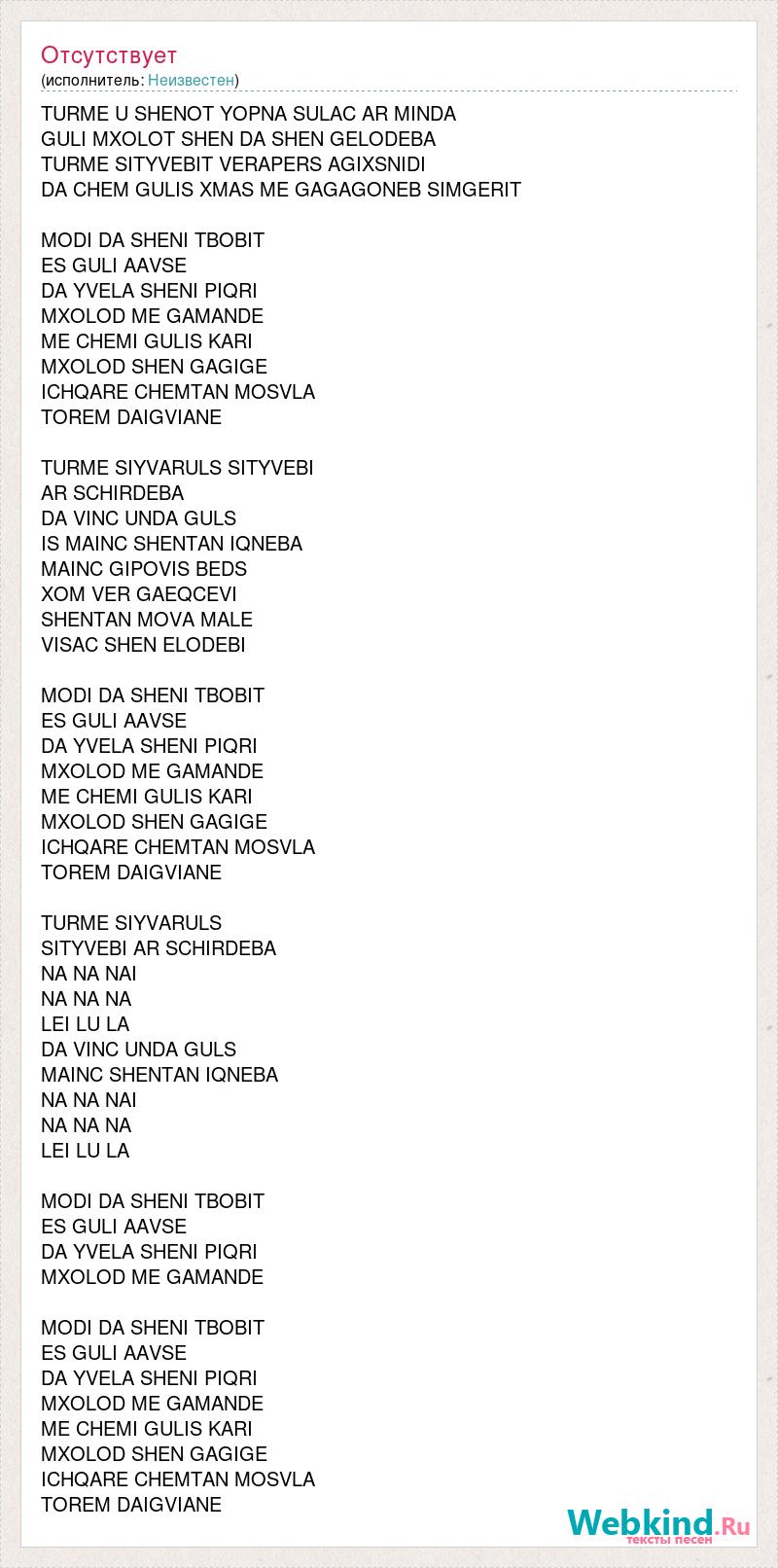 TURME U SHENOT YOPNA SULAC AR MINDA GULI MXOLOT SHEN DA SHEN GELODEBA TURME SITYVEBIT VERAPERS AGIXSNIDI DA CHEM GULIS XMAS ME GAGAGONEB SIMGERIT MODI DA SHENI TBOBIT ES GULI AAVSE DA YVELA SHENI PIQRI MXOLOD ME GAMANDE ME CHEMI GULIS KARI MXOLOD SHEN GAGIGE ICHQARE CHEMTAN MOSVLA TOREM DAIGVIANE TURME SIYVARULS SITYVEBI AR SCHIRDEBA DA VINC UNDA GULS IS MAINC SHENTAN IQNEBA MAINC GIPOVIS BEDS XOM VER GAEQCEVI SHENTAN MOVA MALE VISAC SHEN ELODEBI MODI DA SHENI TBOBIT ES GULI AAVSE DA YVELA SHENI PIQRI MXOLOD ME GAMANDE ME CHEMI GULIS KARI MXOLOD SHEN GAGIGE ICHQARE CHEMTAN MOSVLA TOREM DAIGVIANE TURME SIYVARULS SITYVEBI AR SCHIRDEBA NA NA NAI NA NA NA LEI LU LA DA VINC UNDA GULS MAINC SHENTAN IQNEBA NA NA NAI NA NA NA LEI LU LA MODI DA SHENI TBOBIT ES GULI AAVSE DA YVELA SHENI PIQRI MXOLOD ME GAMANDE MODI DA SHENI TBOBIT ES GULI AAVSE DA YVELA SHENI PIQRI MXOLOD ME GAMANDE ME CHEMI GULIS KARI MXOLOD SHEN GAGIGE ICHQARE CHEMTAN MOSVLA TOREM DAIGVIANE