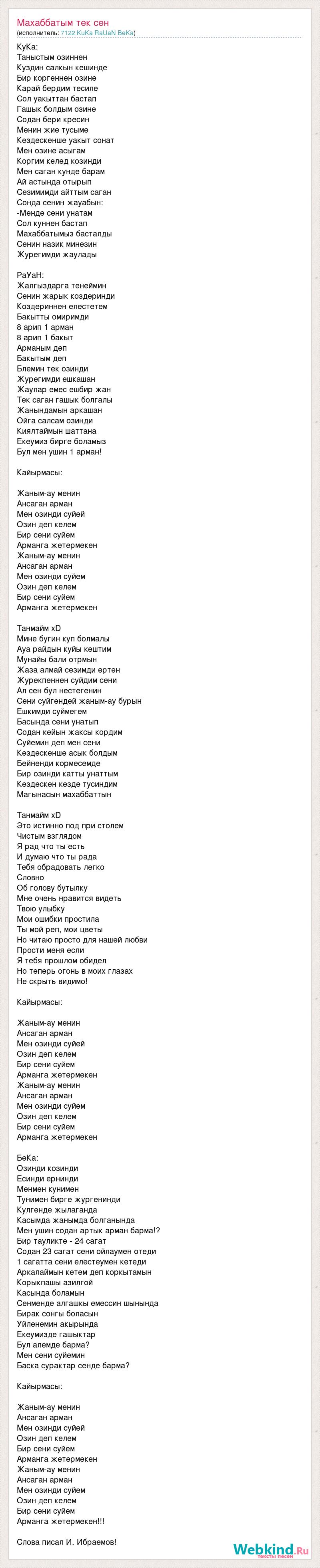 КуКа: Таныстым озиннен Куздин салкын кешинде Бир коргеннен озине Карай бердим тесиле Сол уакыттан бастап Гашык болдым озине Содан бери кресин Менин жие тусыме Кездескенше уакыт сонат Мен озине асыгам Коргим келед козинди Мен саган кунде барам Ай астында отырып Сезимимди айттым саган Сонда сенин жауабын: -Менде сени унатам Сол куннен бастап Махаббатымыз басталды Сенин назик минезин Журегимди жаулады РаУаН: Жалгыздарга тенеймин Сенин жарык коздеринди Коздериннен елестетем Бакытты омиримди 8 арип 1 арман 8 арип 1 бакыт Арманым деп Бакытым деп Блемин тек озинди Журегимди ешкашан Жаулар емес ешбир жан Тек саган гашык болгалы Жанындамын аркашан Ойга салсам озинди Киялтаймын шаттана Екеумиз бирге боламыз Бул мен ушин 1 арман! Кайырмасы: Жаным-ау менин Ансаган арман Мен озинди суйей Озин деп келем Бир сени суйем Арманга жетермекен Жаным-ау менин Ансаган арман Мен озинди суйем Озин деп келем Бир сени суйем Арманга жетермекен Танмайм xD Мине бугин куп болмалы Ауа райдын куйы кештим Мунайы бали отрмын Жаза алмай сезимди ертен Журекпеннен суйдим сени Ал сен бул нестегенин Сени суйгендей жаным-ау бурын Ешкимди суймегем Басында сени унатып Содан кейын жаксы кордим Суйемин деп мен сени Кездескенше асык болдым Бейненди кормесемде Бир озинди катты унаттым Кездескен кезде тусиндим Магынасын махаббаттын Танмайм xD Это истинно под при столем Чистым взглядом Я рад что ты есть И думаю что ты рада Тебя обрадовать легко Словно Об голову бутылку Мне очень нравится видеть Твою улыбку Мои ошибки простила Ты мой реп, мои цветы Но читаю просто для нашей любви Прости меня если Я тебя прошлом обидел Но теперь огонь в моих глазах Не скрыть видимо! Кайырмасы: Жаным-ау менин Ансаган арман Мен озинди суйей Озин деп келем Бир сени суйем Арманга жетермекен Жаным-ау менин Ансаган арман Мен озинди суйем Озин деп келем Бир сени суйем Арманга жетермекен БеКа: Озинди козинди Есинди ернинди Менмен кунимен Тунимен бирге жургенинди Кулгенде жылаганда Касымда жанымда болганында Мен ушин содан артык арман барма!? Бир тауликте - 24 сагат Содан 23 сагат сени ойлаумен отеди 1 сагатта сени елестеумен кетеди Аркалаймын кетем деп коркытамын Корыкпашы азилгой Касында боламын Сенменде алгашкы емессин шынында Бирак сонгы боласын Уйленемин акырында Екеумизде гашыктар Бул алемде барма? Мен сени суйемин Баска сурактар сенде барма? Кайырмасы: Жаным-ау менин Ансаган арман Мен озинди суйей Озин деп келем Бир сени суйем Арманга жетермекен Жаным-ау менин Ансаган арман Мен озинди суйем Озин деп келем Бир сени суйем Арманга жетермекен!!! Слова писал И. Ибраемов!