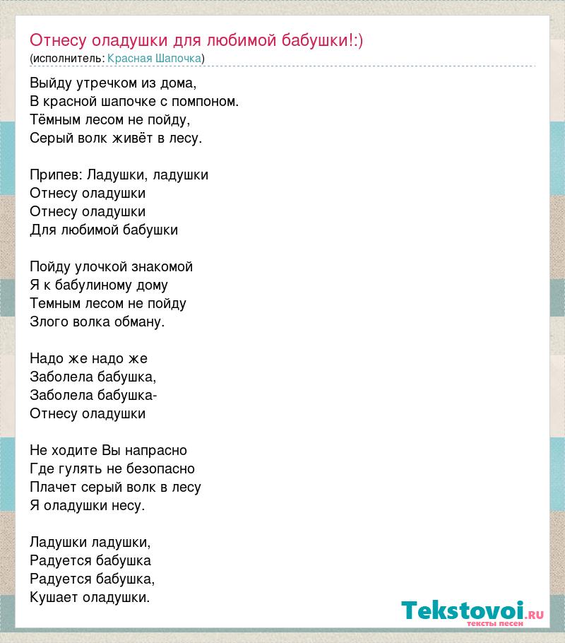 Выйду утречком из дома, В красной шапочке с помпоном. Тёмным лесом не пойду, Серый волк живёт в лесу. Припев: Ладушки, ладушки Отнесу оладушки Отнесу оладушки Для любимой бабушки Пойду улочкой знакомой Я к бабулиному дому Темным лесом не пойду Злого волка обману. Надо же надо же Заболела бабушка, Заболела бабушка- Отнесу оладушки Не ходите Вы напрасно Где гулять не безопасно Плачет серый волк в лесу Я оладушки несу. Ладушки ладушки, Радуется бабушка Радуется бабушка, Кушает оладушки.