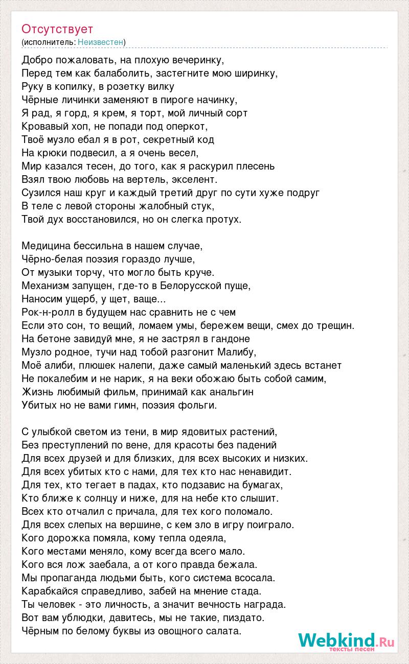 Добро пожаловать, на плохую вечеринку, Перед тем как балаболить, застегните мою ширинку, Руку в копилку, в розетку вилку Чёрные личинки заменяют в пироге начинку, Я рад, я горд, я крем, я торт, мой личный сорт Кровавый хоп, не попади под оперкот, Твоё музло ебал я в рот, секретный код На крюки подвесил, а я очень весел, Мир казался тесен, до того, как я раскурил плесень Взял твою любовь на вертель, экселент. Сузился наш круг и каждый третий друг по сути хуже подруг В теле с левой стороны жалобный стук, Твой дух восстановился, но он слегка протух. Медицина бессильна в нашем случае, Чёрно-белая поэзия гораздо лучше, От музыки торчу, что могло быть круче. Механизм запущен, где-то в Белорусской пуще, Наносим ущерб, у щет, ваще... Рок-н-ролл в будущем нас сравнить не с чем Если это сон, то вещий, ломаем умы, бережем вещи, смех до трещин. На бетоне завидуй мне, я не застрял в гандоне Музло родное, тучи над тобой разгонит Малибу, Моё алиби, плюшек налепи, даже самый маленький здесь встанет Не покалебим и не нарик, я на веки обожаю быть собой самим, Жизнь любимый фильм, принимай как анальгин Убитых но не вами гимн, поэзия фольги. С улыбкой светом из тени, в мир ядовитых растений, Без преступлений по вене, для красоты без падений Для всех друзей и для близких, для всех высоких и низких. Для всех убитых кто с нами, для тех кто нас ненавидит. Для тех, кто тегает в падах, кто подзавис на бумагах, Кто ближе к солнцу и ниже, для на небе кто слышит. Всех кто отчалил с причала, для тех кого поломало. Для всех слепых на вершине, с кем зло в игру поиграло. Кого дорожка помяла, кому тепла одеяла, Кого местами меняло, кому всегда всего мало. Кого вся лож заебала, а от кого правда бежала. Мы пропаганда людьми быть, кого система всосала. Карабкайся справедливо, забей на мнение стада. Ты человек - это личность, а значит вечность награда. Вот вам ублюдки, давитесь, мы не такие, пиздато. Чёрным по белому буквы из овощного салата.