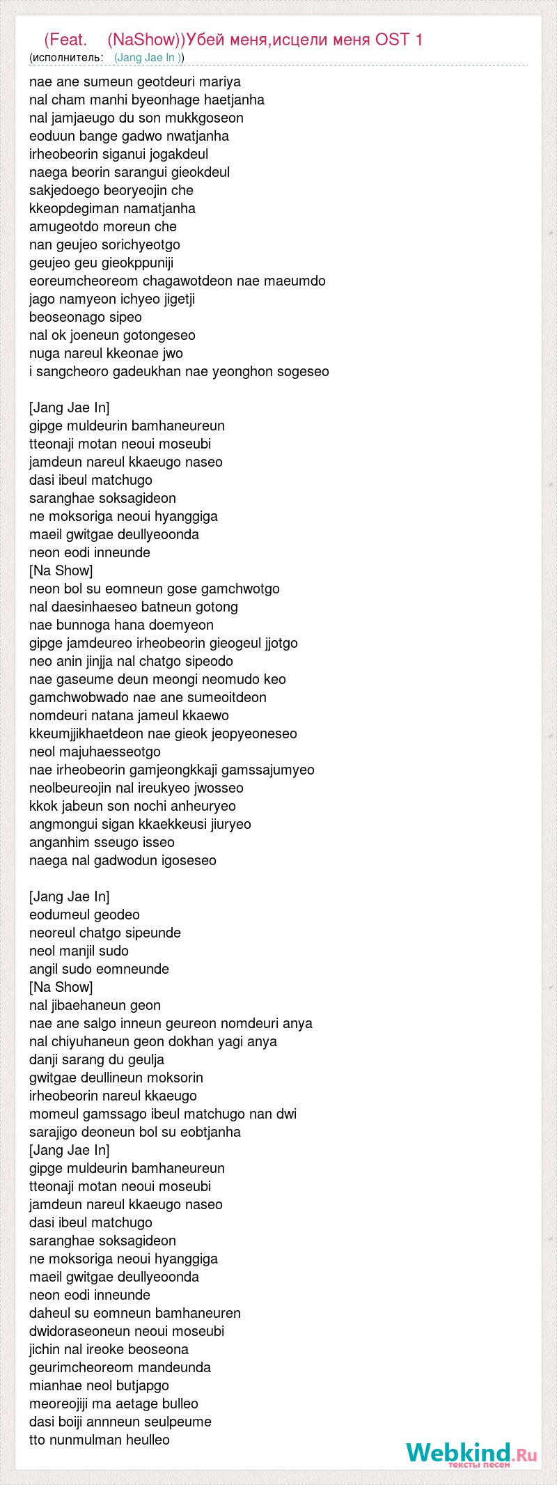 nae ane sumeun geotdeuri mariya nal cham manhi byeonhage haetjanha nal jamjaeugo du son mukkgoseon eoduun bange gadwo nwatjanha irheobeorin siganui jogakdeul naega beorin sarangui gieokdeul sakjedoego beoryeojin che kkeopdegiman namatjanha amugeotdo moreun che nan geujeo sorichyeotgo geujeo geu gieokppuniji eoreumcheoreom chagawotdeon nae maeumdo jago namyeon ichyeo jigetji beoseonago sipeo nal ok joeneun gotongeseo nuga nareul kkeonae jwo i sangcheoro gadeukhan nae yeonghon sogeseo [Jang Jae In] gipge muldeurin bamhaneureun tteonaji motan neoui moseubi jamdeun nareul kkaeugo naseo dasi ibeul matchugo saranghae soksagideon ne moksoriga neoui hyanggiga maeil gwitgae deullyeoonda neon eodi inneunde [Na Show] neon bol su eomneun gose gamchwotgo nal daesinhaeseo batneun gotong nae bunnoga hana doemyeon gipge jamdeureo irheobeorin gieogeul jjotgo neo anin jinjja nal chatgo sipeodo nae gaseume deun meongi neomudo keo gamchwobwado nae ane sumeoitdeon nomdeuri natana jameul kkaewo kkeumjjikhaetdeon nae gieok jeopyeoneseo neol majuhaesseotgo nae irheobeorin gamjeongkkaji gamssajumyeo neolbeureojin nal ireukyeo jwosseo kkok jabeun son nochi anheuryeo angmongui sigan kkaekkeusi jiuryeo anganhim sseugo isseo naega nal gadwodun igoseseo [Jang Jae In] eodumeul geodeo neoreul chatgo sipeunde neol manjil sudo angil sudo eomneunde [Na Show] nal jibaehaneun geon nae ane salgo inneun geureon nomdeuri anya nal chiyuhaneun geon dokhan yagi anya danji sarang du geulja gwitgae deullineun moksorin irheobeorin nareul kkaeugo momeul gamssago ibeul matchugo nan dwi sarajigo deoneun bol su eobtjanha [Jang Jae In] gipge muldeurin bamhaneureun tteonaji motan neoui moseubi jamdeun nareul kkaeugo naseo dasi ibeul matchugo saranghae soksagideon ne moksoriga neoui hyanggiga maeil gwitgae deullyeoonda neon eodi inneunde daheul su eomneun bamhaneuren dwidoraseoneun neoui moseubi jichin nal ireoke beoseona geurimcheoreom mandeunda mianhae neol butjapgo meoreojiji ma aetage bulleo dasi boiji annneun seulpeume tto nunmulman heulleo