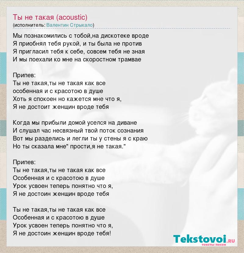 Мы познакомились с тобой,на дискотеке вроде Я приобнял тебя рукой, и ты была не против Я пригласил тебя к себе, совсем тебя не зная И мы поехали ко мне на скоростном трамвае Припев: Ты не такая,ты не такая как все особенная и с красотою в душе Хоть я спокоен но кажется мне что я, Я не достоит женщин вроде тебя Когда мы прибыли домой уселся на диване И слушал час несвязный твой поток сознания Вот мы разделись и легли ты у стены я с краю Но ты сказала мне" прости,я не такая." Припев: Ты не такая,ты не такая как все Особенная и с красотою в душе Урок усвоен теперь понятно что я, Я не достоин женщин вроде тебя Ты не такая,ты не такая как все Особенная и с красотою в душе Урок усвоен теперь понятно что я, Я не достоин женщин вроде тебя!
