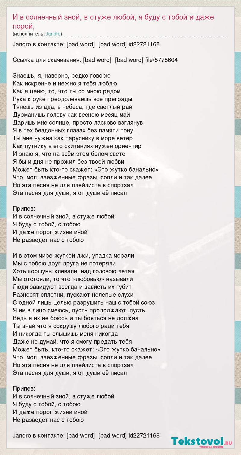 Jandro в контакте: [bad word] [bad word] id22721168 Ссылка для скачивания: [bad word] [bad word] file/5775604 Знаешь, я, наверно, редко говорю Как искренне и нежно я тебя люблю Как я ценю, то, что ты со мною рядом Рука к руке преодолеваешь все преграды Тянешь из ада, в небеса, где светлый рай Дурманишь голову как весною месяц май Даришь мне солнце, просто ласково взглянув Я в тех бездонных глазах без памяти тону Ты мне нужна как паруснику в море ветер Как путнику в его скитаниях нужен ориентир И знаю я, что на всём этом белом свете Я бы и дня не прожил без твоей любви Может быть кто-то скажет: «Это жутко банально» Что, мол, заезженные фразы, сопли и так далее Но эта песня не для плейлиста в спортзал Эта песня для души, я от души её писал Припев: И в солнечный зной, в стуже любой Я буду с тобой, с тобою И даже порог жизни иной Не разведет нас с тобою И в этом мире жуткой лжи, упадка морали Мы с тобою друг друга не потеряли Хоть коршуны клевали, над головою летая Мы отстояли, то что «любовью» называли Люди завидуют всегда и зависть их губит Разносят сплетни, пускают нелепые слухи С одной лишь целью разрушить наш с тобой союз Я им в лицо смеюсь, пусть продолжают, пусть Ведь я их не боюсь и ты бояться не должна Ты знай что я сокрушу любого ради тебя И никогда ты слышишь меня никогда Даже не думай, что я смогу предать тебя Может быть, кто-то скажет: «Это жутко банально» Что, мол, заезженные фразы, сопли и так далее Но эта песня не для плейлиста в спортзал Эта песня для души, я от души её писал Припев: И в солнечный зной, в стуже любой Я буду с тобой, с тобою И даже порог жизни иной Не разведет нас с тобою Jandro в контакте: [bad word] [bad word] id22721168