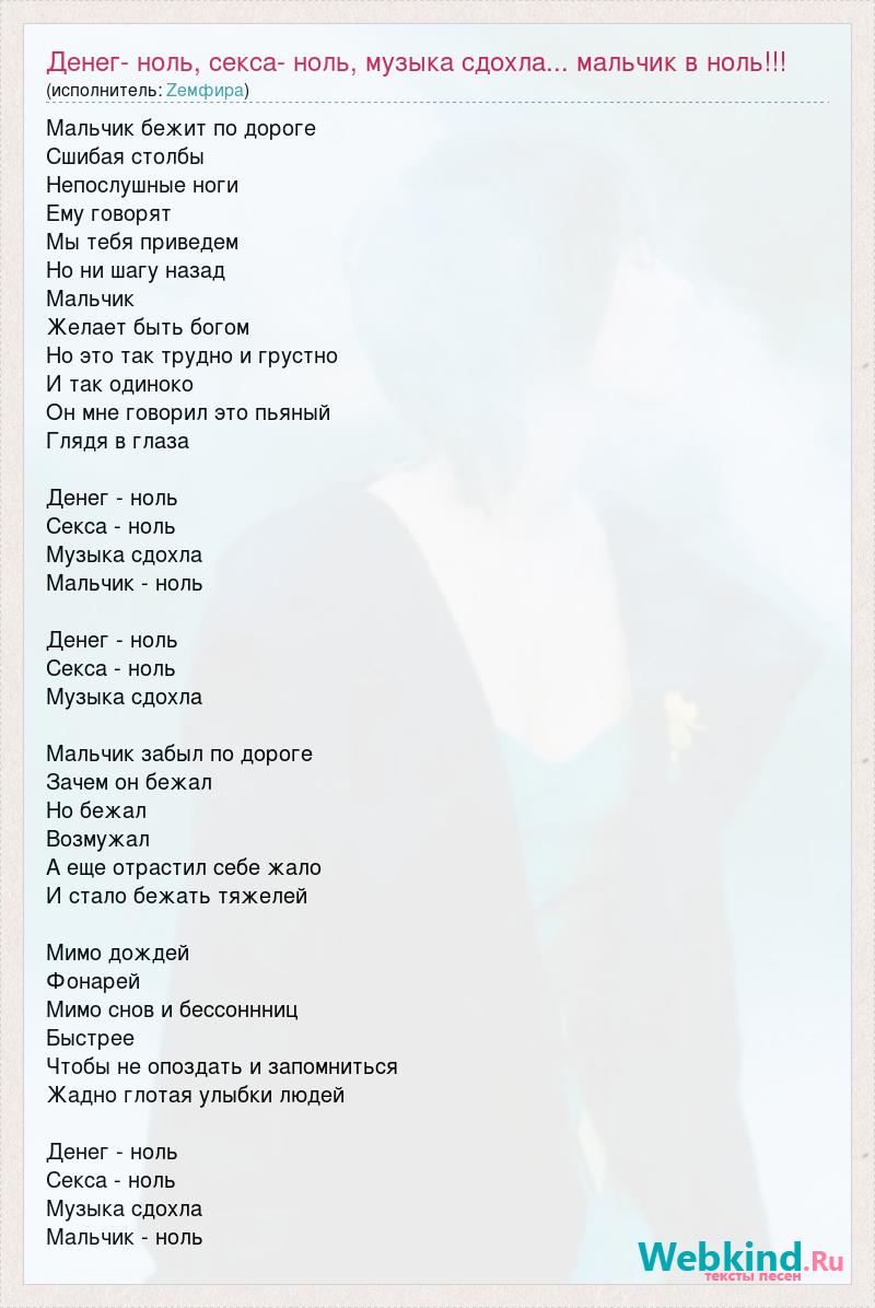 Мальчик бежит по дороге Сшибая столбы Непослушные ноги Ему говорят Мы тебя приведем Но ни шагу назад Мальчик Желает быть богом Но это так трудно и грустно И так одиноко Он мне говорил это пьяный Глядя в глаза Денег - ноль Секса - ноль Музыка сдохла Мальчик - ноль Денег - ноль Секса - ноль Музыка сдохла Мальчик забыл по дороге Зачем он бежал Но бежал Возмужал А еще отрастил себе жало И стало бежать тяжелей Мимо дождей Фонарей Мимо снов и бессоннниц Быстрее Чтобы не опоздать и запомниться Жадно глотая улыбки людей Денег - ноль Секса - ноль Музыка сдохла Мальчик - ноль