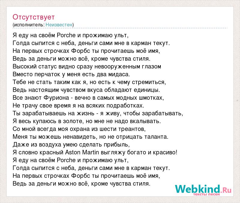 Я еду на своём Porche и прожимаю ульт, Голда сыпится с неба, деньги сами мне в карман текут. На первых строчках Форбс ты прочитаешь моё имя, Ведь за деньги можно всё, кроме чувства стиля. Высокий статус видно сразу невооруженным глазом Вместо перчаток у меня есть два мидаса. Тебе не стать таким как я, но есть к чему стремиться, Ведь настоящим чувством вкуса обладают единицы. Все знают Фуриона - вечно в самых модных шмотках, Не трачу свое время я на всяких подработках. Ты зарабатываешь на жизнь - я живу, чтобы зарабатывать, Я весь купаюсь в золоте, но мне не надо вкалывать. Со мной всегда моя охрана из шести треантов, Меня ты можешь ненавидеть, но не отрицать таланта. Даже из воздуха умею сделать прибыль, Я словно красный Aston Martin выгляжу богато и красиво! Я еду на своём Porche и прожимаю ульт, Голда сыпится с неба, деньги сами мне в карман текут. На первых строчках Форбс ты прочитаешь моё имя, Ведь за деньги можно всё, кроме чувства стиля.