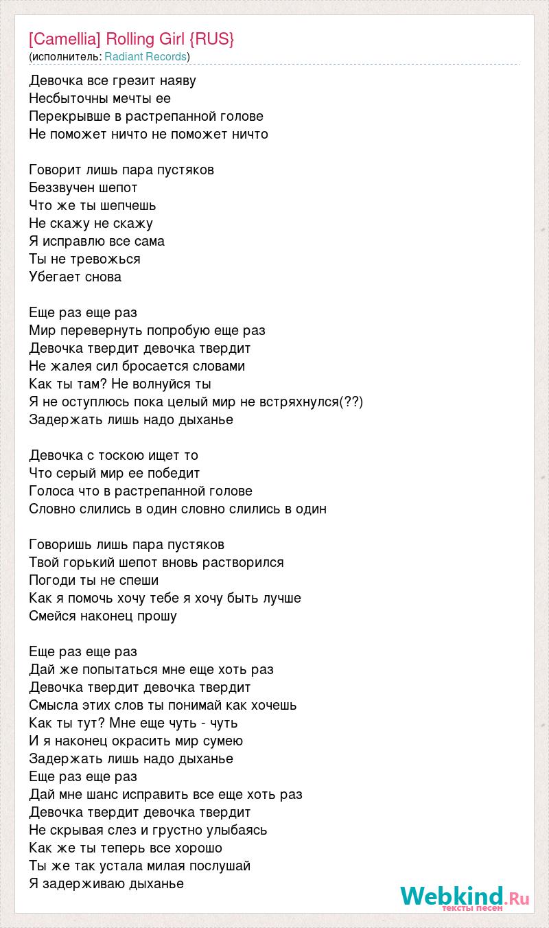 Девочка все грезит наяву Несбыточны мечты ее Перекрывше в растрепанной голове Не поможет ничто не поможет ничто Говорит лишь пара пустяков Беззвучен шепот Что же ты шепчешь Не скажу не скажу Я исправлю все сама Ты не тревожься Убегает снова Еще раз еще раз Мир перевернуть попробую еще раз Девочка твердит девочка твердит Не жалея сил бросается словами Как ты там? Не волнуйся ты Я не оступлюсь пока целый мир не встряхнулся(??) Задержать лишь надо дыханье Девочка с тоскою ищет то Что серый мир ее победит Голоса что в растрепанной голове Словно слились в один словно слились в один Говоришь лишь пара пустяков Твой горький шепот вновь растворился Погоди ты не спеши Как я помочь хочу тебе я хочу быть лучше Смейся наконец прошу Еще раз еще раз Дай же попытаться мне еще хоть раз Девочка твердит девочка твердит Смысла этих слов ты понимай как хочешь Как ты тут? Мне еще чуть - чуть И я наконец окрасить мир сумею Задержать лишь надо дыханье Еще раз еще раз Дай мне шанс исправить все еще хоть раз Девочка твердит девочка твердит Не скрывая слез и грустно улыбаясь Как же ты теперь все хорошо Ты же так устала милая послушай Я задерживаю дыханье