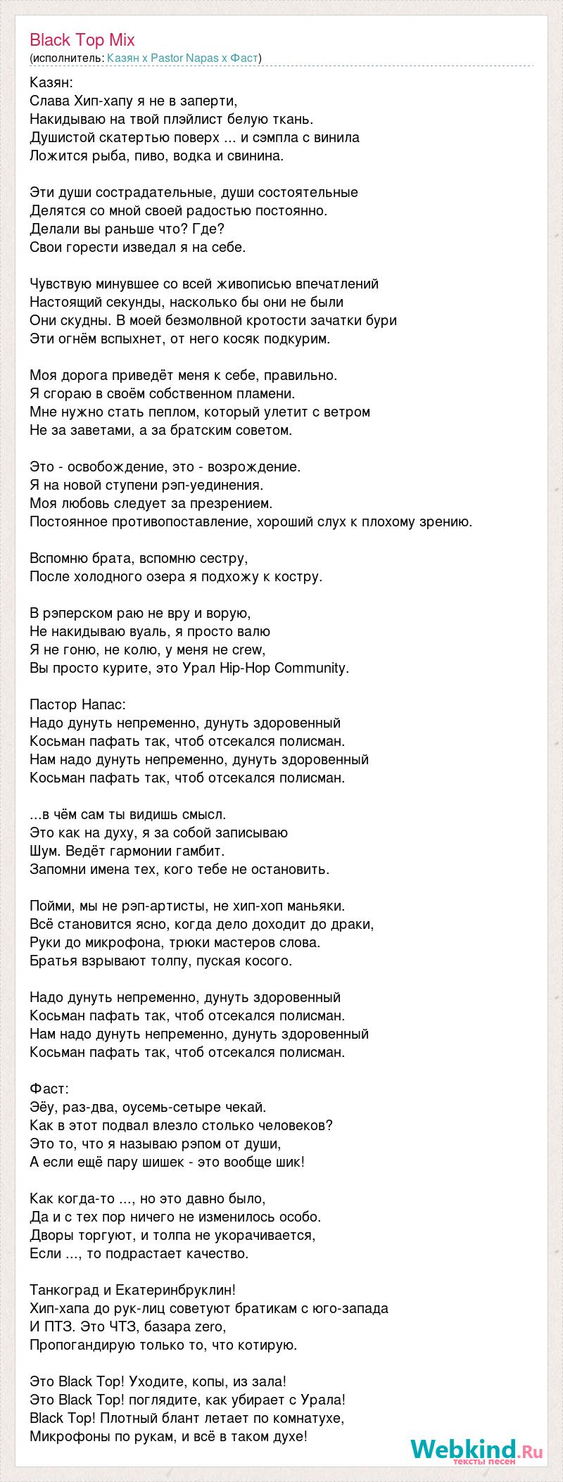 Казян: Слава Хип-хапу я не в заперти, Накидываю на твой плэйлист белую ткань. Душистой скатертью поверх ... и сэмпла с винила Ложится рыба, пиво, водка и свинина. Эти души сострадательные, души состоятельные Делятся со мной своей радостью постоянно. Делали вы раньше что? Где? Свои горести изведал я на себе. Чувствую минувшее со всей живописью впечатлений Настоящий секунды, насколько бы они не были Они скудны. В моей безмолвной кротости зачатки бури Эти огнём вспыхнет, от него косяк подкурим. Моя дорога приведёт меня к себе, правильно. Я сгораю в своём собственном пламени. Мне нужно стать пеплом, который улетит с ветром Не за заветами, а за братским советом. Это - освобождение, это - возрождение. Я на новой ступени рэп-уединения. Моя любовь следует за презрением. Постоянное противопоставление, хороший слух к плохому зрению. Вспомню брата, вспомню сестру, После холодного озера я подхожу к костру. В рэперском раю не вру и ворую, Не накидываю вуаль, я просто валю Я не гоню, не колю, у меня не crew, Вы просто курите, это Урал Hip-Hop Community. Пастор Напас: Надо дунуть непременно, дунуть здоровенный Косьман пафать так, чтоб отсекался полисман. Нам надо дунуть непременно, дунуть здоровенный Косьман пафать так, чтоб отсекался полисман. ...в чём сам ты видишь смысл. Это как на духу, я за собой записываю Шум. Ведёт гармонии гамбит. Запомни имена тех, кого тебе не остановить. Пойми, мы не рэп-артисты, не хип-хоп маньяки. Всё становится ясно, когда дело доходит до драки, Руки до микрофона, трюки мастеров слова. Братья взрывают толпу, пуская косого. Надо дунуть непременно, дунуть здоровенный Косьман пафать так, чтоб отсекался полисман. Нам надо дунуть непременно, дунуть здоровенный Косьман пафать так, чтоб отсекался полисман. Фаст: Эёу, раз-два, оусемь-сетыре чекай. Как в этот подвал влезло столько человеков? Это то, что я называю рэпом от души, А если ещё пару шишек - это вообще шик! Как когда-то ..., но это давно было, Да и с тех пор ничего не изменилось особо. Дворы торгуют, и толпа не укорачивается, Если ..., то подрастает качество. Танкоград и Екатеринбруклин! Хип-хапа до рук-лиц советуют братикам с юго-запада И ПТЗ. Это ЧТЗ, базара zero, Пропогандирую только то, что котирую. Это Black Top! Уходите, копы, из зала! Это Black Top! поглядите, как убирает с Урала! Black Top! Плотный блант летает по комнатухе, Микрофоны по рукам, и всё в таком духе!