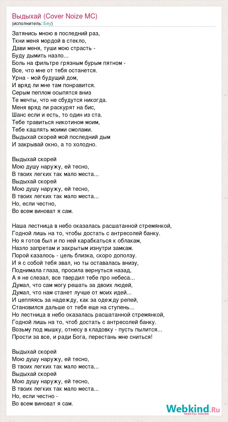 Затянись мною в последний раз, Ткни меня мордой в стекло, Дави меня, туши мою страсть - Буду дымить назло... Боль на фильтре грязным бурым пятном - Все, что мне от тебя останется. Урна - мой будущий дом, И вряд ли мне там понравится. Серым пеплом осыпятся вниз Те мечты, что не сбудутся никогда. Меня вряд ли раскурят на бис, Шанс если и есть, то один из ста. Тебе травиться никотином моим, Тебе кашлять моими смолами. Выдыхай скорей мой последний дым И закрывай окно, а то холодно. Выдыхай скорей Мою душу наружу, ей тесно, В твоих легких так мало места... Выдыхай скорей Мою душу наружу, ей тесно, В твоих легких так мало места... Но, если честно, Во всем виноват я сам. Наша лестница в небо оказалась расшатанной стремянкой, Годной лишь на то, чтобы достать с антресолей банку. Но я готов был и по ней карабкаться к облакам, Назло запретам и закрытым изнутри замкам. Порой казалось - цель близка, скоро доползу. И я с собой тебя звал, но ты оставалась внизу, Поднимала глаза, просила вернуться назад, А я не слезал, все твердил тебе про небеса... Думал, что сам могу решать за двоих людей, Думал, что нам станет лучше от моих идей... И цепляясь за надежду, как за одежду репей, Становился дальше от тебя еще на ступень... Но лестница в небо оказалась расшатанной стремянкой, Годной лишь на то, чтоб достать с антресолей банку. Возьму под мышку, отнесу в кладовку - пусть пылится... Прости за все, и ради Бога, перестань мне сниться! Выдыхай скорей Мою душу наружу, ей тесно, В твоих легких так мало места... Выдыхай скорей Мою душу наружу, ей тесно, В твоих легких так мало места... Но, если честно - Во всем виноват я сам.