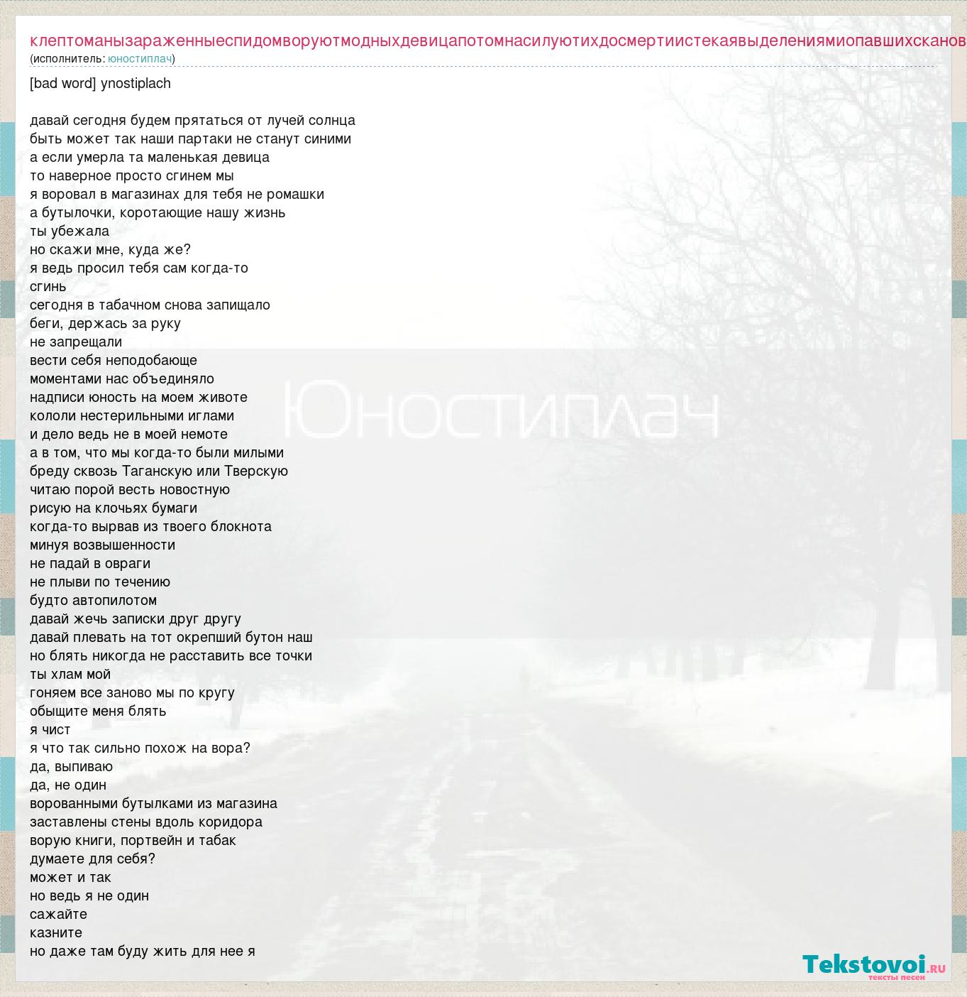 [bad word] ynostiplach давай сегодня будем прятаться от лучей солнца быть может так наши партаки не станут синими а если умерла та маленькая девица то наверное просто сгинем мы я воровал в магазинах для тебя не ромашки а бутылочки, коротающие нашу жизнь ты убежала но скажи мне, куда же? я ведь просил тебя сам когда-то сгинь сегодня в табачном снова запищало беги, держась за руку не запрещали вести себя неподобающе моментами нас объединяло надписи юность на моем животе кололи нестерильными иглами и дело ведь не в моей немоте а в том, что мы когда-то были милыми бреду сквозь Таганскую или Тверскую читаю порой весть новостную рисую на клочьях бумаги когда-то вырвав из твоего блокнота минуя возвышенности не падай в овраги не плыви по течению будто автопилотом давай жечь записки друг другу давай плевать на тот окрепший бутон наш но блять никогда не расставить все точки ты хлам мой гоняем все заново мы по кругу обыщите меня блять я чист я что так сильно похож на вора? да, выпиваю да, не один ворованными бутылками из магазина заставлены стены вдоль коридора ворую книги, портвейн и табак думаете для себя? может и так но ведь я не один сажайте казните но даже там буду жить для нее я