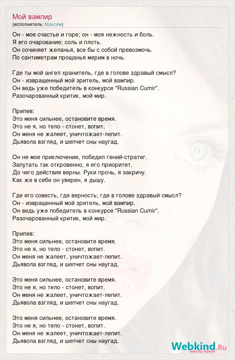 Он - мое счастье и горе; он - моя нежность и боль. Я его очарование; соль и плоть. Он сочиняет желанья, все бы с собой превозмочь. По сантиметрам прощанья мерим в ночь. Где ты мой ангел хранитель, где в голове здравый смысл? Он - извращенный мой зритель, мой вампир. Он ведь уже победитель в конкурсе "Russian Cumir". Разочарованный критик, мой мир. Припев: Это меня сильнее, остановите время. Это не я, но тело - стонет, вопит. Он меня не жалеет, уничтожает-лепит. Дьявола взгляд, и шепчет сны наугад. Он не мое приключение, победил гений-стратег. Запутать так откровенно, я его приоритет. До чего действия верны. Руки прочь, я закричу. Как же в себе он уверен, я дышу. Где его совесть, где верность; где в голове здравый смысл? Он - извращенный мой зритель, мой вампир. Он ведь уже победитель в конкурсе "Russian Cumir". Разочарованный критик, мой мир. Припев: Это меня сильнее, остановите время. Это не я, но тело - стонет, вопит. Он меня не жалеет, уничтожает-лепит. Дьявола взгляд, и шепчет сны наугад. Это меня сильнее, остановите время. Это не я, но тело - стонет, вопит. Он меня не жалеет, уничтожает-лепит. Дьявола взгляд, и шепчет сны наугад. Это меня сильнее, остановите время. Это не я, но тело - стонет, вопит. Он меня не жалеет, уничтожает-лепит. Дьявола взгляд, и шепчет сны наугад.