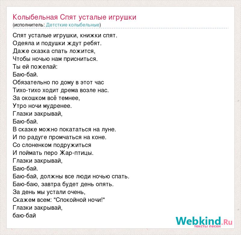 Спят усталые игрушки, книжки спят. Одеяла и подушки ждут ребят. Даже сказка спать ложится, Чтобы ночью нам присниться. Ты ей пожелай: Баю-бай. Обязательно по дому в этот час Тихо-тихо ходит дрема возле нас. За окошком всё темнее, Утро ночи мудренее. Глазки закрывай, Баю-бай. В сказке можно покататься на луне. И по радуге промчаться на коне. Со слоненком подружиться И поймать перо Жар-птицы. Глазки закрывай, Баю-бай. Баю-бай, должны все люди ночью спать. Баю-баю, завтра будет день опять. За день мы устали очень, Скажем всем: "Спокойной ночи!" Глазки закрывай, баю-бай