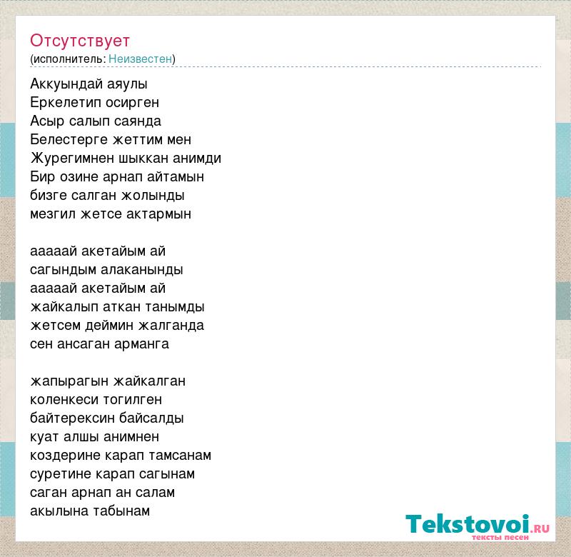 Аккуындай аяулы Еркелетип осирген Асыр салып саянда Белестерге жеттим мен Журегимнен шыккан анимди Бир озине арнап айтамын бизге салган жолынды мезгил жетсе актармын ааааай акетайым ай сагындым алаканынды ааааай акетайым ай жайкалып аткан танымды жетсем деймин жалганда сен ансаган арманга жапырагын жайкалган коленкеси тогилген байтерексин байсалды куат алшы анимнен коздерине карап тамсанам суретине карап сагынам саган арнап ан салам акылына табынам