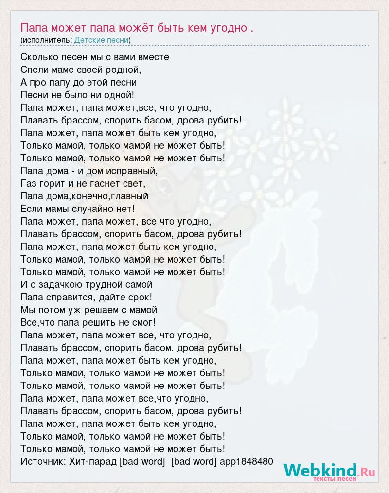 Сколько песен мы с вами вместе Спели маме своей родной, А про папу до этой песни Песни не было ни одной! Папа может, папа может,все, что угодно, Плавать брассом, спорить басом, дрова рубить! Папа может, папа может быть кем угодно, Только мамой, только мамой не может быть! Только мамой, только мамой не может быть! Папа дома - и дом исправный, Газ горит и не гаснет свет, Папа дома,конечно,главный Если мамы случайно нет! Папа может, папа может, все что угодно, Плавать брассом, спорить басом, дрова рубить! Папа может, папа может быть кем угодно, Только мамой, только мамой не может быть! Только мамой, только мамой не может быть! И с задачкою трудной самой Папа справится, дайте срок! Мы потом уж решаем с мамой Все,что папа решить не смог! Папа может, папа может все, что угодно, Плавать брассом, спорить басом, дрова рубить! Папа может, папа может быть кем угодно, Только мамой, только мамой не может быть! Только мамой, только мамой не может быть! Папа может, папа может все,что угодно, Плавать брассом, спорить басом, дрова рубить! Папа может, папа может быть кем угодно, Только мамой, только мамой не может быть! Только мамой, только мамой не может быть! Источник: Хит-парад [bad word] [bad word] app1848480