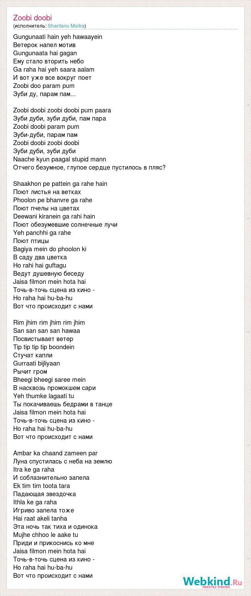 Gungunaati hain yeh hawaayein Ветерок напел мотив Gungunaata hai gagan Ему стало вторить небо Ga raha hai yeh saara aalam И вот уже все вокруг поет Zoobi doo param pum Зуби ду, парам пам... Zoobi doobi zoobi doobi pum paara Зуби дуби, зуби дуби, пам пара Zoobi doobi param pum Зуби-дуби, парам пам Zoobi doobi zoobi doobi Зуби дуби, зуби дуби Naache kyun paagal stupid mann Отчего безумное, глупое сердце пустилось в пляс? Shaakhon pe pattein ga rahe hain Поют листья на ветках Phoolon pe bhanvre ga rahe Поют пчелы на цветах Deewani kiranein ga rahi hain Поют обезумевшие солнечные лучи Yeh panchhi ga rahe Поют птицы Bagiya mein do phoolon ki В саду два цветка Ho rahi hai guftagu Ведут душевную беседу Jaisa filmon mein hota hai Точь-в-точь сцена из кино - Ho raha hai hu-ba-hu Вот что происходит с нами Rim jhim rim jhim rim jhim San san san san hawaa Посвистывает ветер Tip tip tip tip boondein Стучат капли Gurraati bijliyaan Рычит гром Bheegi bheegi saree mein В насквозь промокшем сари Yeh thumke lagaati tu Ты покачиваешь бедрами в танце Jaisa filmon mein hota hai Точь-в-точь сцена из кино - Ho raha hai hu-ba-hu Вот что происходит с нами Ambar ka chaand zameen par Луна спустилась с неба на землю Itra ke ga raha И соблазнительно запела Ek tim tim toota tara Падающая звездочка Ithla ke ga raha Игриво запела тоже Hai raat akeli tanha Эта ночь так тиха и одинока Mujhe chhoo le aake tu Приди и прикоснись ко мне Jaisa filmon mein hota hai Точь-в-точь сцена из кино - Ho raha hai hu-ba-hu Вот что происходит с нами