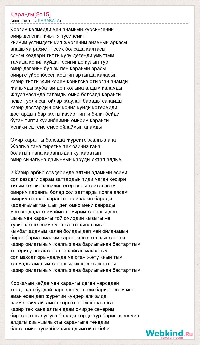 Коргим келмейди мен анамнын курсингенин омир дегенин киын я тусинемин киимим устимдеги кип жургеним анамнын аркасы анашыма рахмет тесик болсада калтасы сонгы кездери типти кулу дегенди умыттым тамаша конил куйдин есигинде кулып тур омир дегенин бул ак пен каранын арасы омирге уйренбесен коштин артында каласын казир типти жии корем конилсиз отырган анамды жанымды жубатам деп колыма алдым каламды жауламасамда галамды омир болсада карангы неше турли сан ойлар жаулап барады санамды казир достардын ози конил куйди котермиди достардын бар жогы казир типти билинбейди буган типти куйинбеймин омирим карангы меники ештеме емес ойлаймын анамды Омир карангы болсада журекте жалгыз ана Жалгыз гана тирегим тек озиниз гана болатын пана карангыдан куткаратын омир сынагына дайынмын каруды октап алдым 2.Казир арбир создеримде алтын адамнын есими сол кездеги харам заттардын тиди маган кесири тилим кетсин кесилип егер соны кайталасам омирим карангы болад сол заттарды колга алсам омирим сарсан карангыга айналып барады карангылыктан шык деп омир мени кайрады мен сондада коймаймын омирим карангы деп шынымен карангы гой омирдин кызыгы не тусип кетсе есиме мен катты киналамын кымбат адамым калай болады деп мен ойланамын бирак барма амалым карангылык кол кыскартты казир ойлатыным жалгыз ана барлыгынан бастарттым котерилу аскактап алга койган максатым сол максат орындалуда ма оган жету киын тым калмады амалым карангылык кол кыскартты казир ойлатыным жалгыз ана барлыгынан бастарттым Коркамын кейде мен карангы деген нарседен корде кал бундай нарселермен али барин тесем мен аман есен деп журетин кундер али алда озиме озим айтамын корыкпа тек кана алга казир тек кана алтын адам омирде сенерим бир канатсыз ушуга болады корде тур барин женемин алдагы киыншылыкты карангыга тенедим баста омир тусинбей киналдымгой себеби