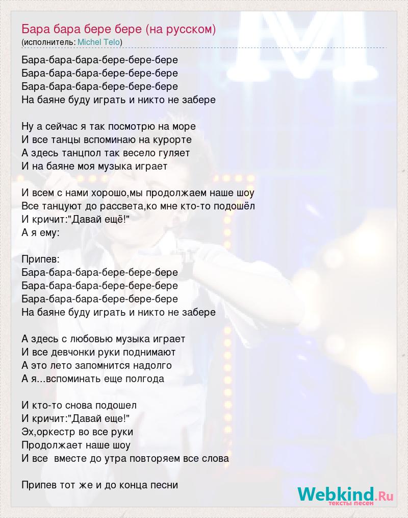 Бара-бара-бара-бере-бере-бере Бара-бара-бара-бере-бере-бере Бара-бара-бара-бере-бере-бере На баяне буду играть и никто не забере Ну а сейчас я так посмотрю на море И все танцы вспоминаю на курорте А здесь танцпол так весело гуляет И на баяне моя музыка играет И всем с нами хорошо,мы продолжаем наше шоу Все танцуют до рассвета,ко мне кто-то подошёл И кричит:"Давай ещё!" А я ему: Припев: Бара-бара-бара-бере-бере-бере Бара-бара-бара-бере-бере-бере Бара-бара-бара-бере-бере-бере На баяне буду играть и никто не забере А здесь с любовью музыка играет И все девчонки руки поднимают А это лето запомнится надолго А я...вспоминать еще полгода И кто-то снова подошел И кричит:"Давай еще!" Эх,оркестр во все руки Продолжает наше шоу И все вместе до утра повторяем все слова Припев тот же и до конца песни