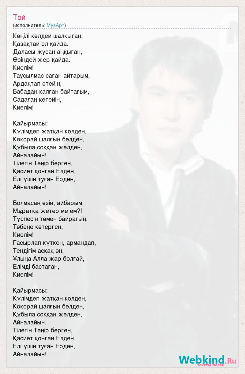 Көңілі көлдей шалқыған, Қазақтай ел қайда. Даласы жусан аңқыған, Өзіңдей жер қайда. Киелім! Таусылмас саған айтарым, Ардақтап өтейін, Бабадан қалған байтағым, Садағаң кетейін, Киелім! Қайырмасы: Күлімдеп жатқан көлден, Көкорай шалғын белден, Құбыла соққан желден, Айналайын! Тілегін Тәңір берген, Қасиет қонған Елден, Елі үшін туған Ерден, Айналайын! Болмасаң өзің, айбарым, Мұратқа жетер ме ем?! Түспесін төмен байрағың, Төбеңе көтерген, Киелім! Ғасырлап күткен, армандап, Теңдігім асқақ ән, Ұлыңа Алла жар болғай, Елімді бастаған, Киелім! Қайырмасы: Күлімдеп жатқан көлден, Көкорай шалғын белден, Құбыла соққан желден, Айналайын. Тілегін Тәңір берген, Қасиет қонған Елден, Елі үшін туған Ерден, Айналайын!