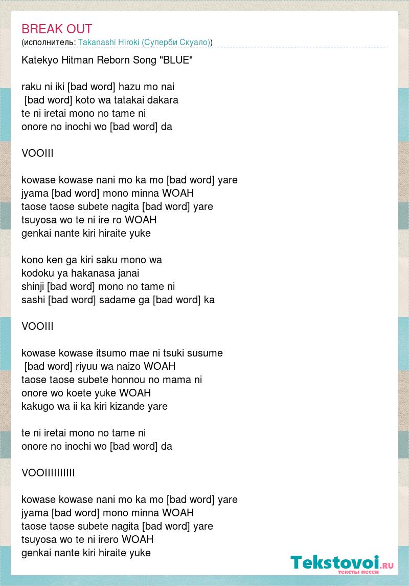 Katekyo Hitman Reborn Song "BLUE" raku ni iki [bad word] hazu mo nai [bad word] koto wa tatakai dakara te ni iretai mono no tame ni onore no inochi wo [bad word] da VOOIII kowase kowase nani mo ka mo [bad word] yare jyama [bad word] mono minna WOAH taose taose subete nagita [bad word] yare tsuyosa wo te ni ire ro WOAH genkai nante kiri hiraite yuke kono ken ga kiri saku mono wa kodoku ya hakanasa janai shinji [bad word] mono no tame ni sashi [bad word] sadame ga [bad word] ka VOOIII kowase kowase itsumo mae ni tsuki susume [bad word] riyuu wa naizo WOAH taose taose subete honnou no mama ni onore wo koete yuke WOAH kakugo wa ii ka kiri kizande yare te ni iretai mono no tame ni onore no inochi wo [bad word] da VOOIIIIIIIIII kowase kowase nani mo ka mo [bad word] yare jyama [bad word] mono minna WOAH taose taose subete nagita [bad word] yare tsuyosa wo te ni irero WOAH genkai nante kiri hiraite yuke