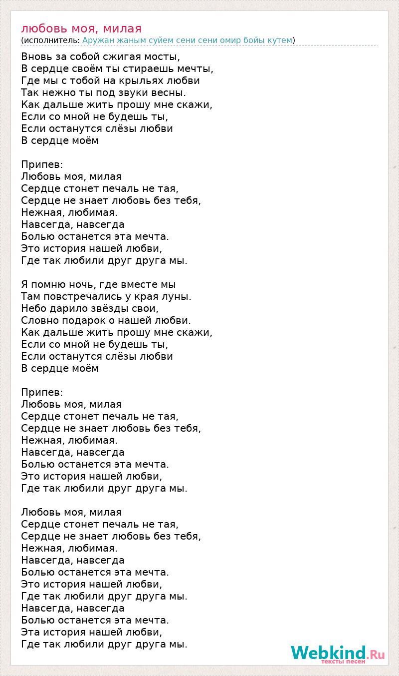 Вновь за собой сжигая мосты, В сердце своём ты стираешь мечты, Где мы с тобой на крыльях любви Так нежно ты под звуки весны. Как дальше жить прошу мне скажи, Если со мной не будешь ты, Если останутся слёзы любви В сердце моём Припев: Любовь моя, милая Сердце стонет печаль не тая, Сердце не знает любовь без тебя, Нежная, любимая. Навсегда, навсегда Болью останется эта мечта. Это история нашей любви, Где так любили друг друга мы. Я помню ночь, где вместе мы Там повстречались у края луны. Небо дарило звёзды свои, Словно подарок о нашей любви. Как дальше жить прошу мне скажи, Если со мной не будешь ты, Если останутся слёзы любви В сердце моём Припев: Любовь моя, милая Сердце стонет печаль не тая, Сердце не знает любовь без тебя, Нежная, любимая. Навсегда, навсегда Болью останется эта мечта. Это история нашей любви, Где так любили друг друга мы. Любовь моя, милая Сердце стонет печаль не тая, Сердце не знает любовь без тебя, Нежная, любимая. Навсегда, навсегда Болью останется эта мечта. Это история нашей любви, Где так любили друг друга мы. Навсегда, навсегда Болью останется эта мечта. Эта история нашей любви, Где так любили друг друга мы.