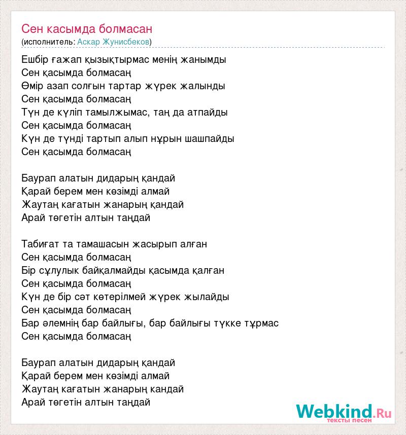Ешбір ғажап қызықтырмас менің жанымды Сен қасымда болмасаң Өмір азап солғын тартар жүрек жалынды Сен қасымда болмасаң Түн де күліп тамылжымас, таң да атпайды Сен қасымда болмасаң Күн де түнді тартып алып нұрын шашпайды Сен қасымда болмасаң Баурап алатын дидарың қандай Қарай берем мен көзімді алмай Жаутаң кағатын жанарың қандай Арай төгетін алтын таңдай Табиғат та тамашасын жасырып алған Сен қасымда болмасаң Бір сұлулык байқалмайды қасымда қалған Сен қасымда болмасаң Күн де бір сәт көтерілмей жүрек жылайды Сен қасымда болмасаң Бар әлемнің бар байлығы, бар байлығы түкке тұрмас Сен қасымда болмасаң Баурап алатын дидарың қандай Қарай берем мен көзімді алмай Жаутаң кағатын жанарың кандай Арай төгетін алтын таңдай