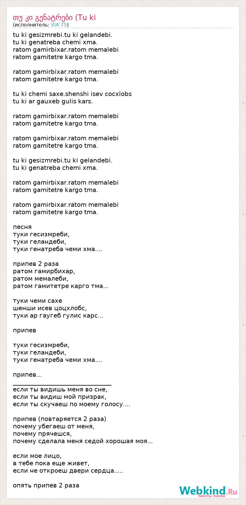 tu ki gesizmrebi.tu ki gelandebi. tu ki genatreba chemi xma. ratom gamirbixar.ratom memalebi ratom gamitetre kargo tma. ratom gamirbixar.ratom memalebi ratom gamitetre kargo tma. tu ki chemi saxe.shenshi isev cocxlobs tu ki ar gauxeb gulis kars. ratom gamirbixar.ratom memalebi ratom gamitetre kargo tma. ratom gamirbixar.ratom memalebi ratom gamitetre kargo tma. tu ki gesizmrebi.tu ki gelandebi. tu ki genatreba chemi xma. ratom gamirbixar.ratom memalebi ratom gamitetre kargo tma. ratom gamirbixar.ratom memalebi ratom gamitetre kargo tma. песня туки гесизмреби, туки геландеби, туки генатреба чеми хма.... припев 2 раза ратом гамирбихар, ратом мемалеби, ратом гамитетре карго тма... туки чеми сахе шенши исев цоцхлобс, туки ар гаугеб гулис карс... припев туки гесизмреби, туки геландеби, туки генатреба чеми хма.... припев... ________________________________ если ты видишь меня во сне, если ты видиш мой призрак, если ты скучаеш по моему голосу.... припев (повтаряется 2 раза) почему убегаеш от меня, почему прячешся, почему сделала меня седой хорошая моя... если мое лицо, в тебе пока еще живет, если не откроеш двери сердца..... опять припев 2 раза